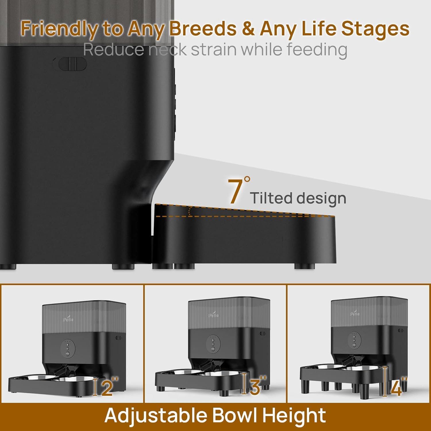 Friendly to Any Breeds & Any Life Stage: The 7° tilted and elevated food tray reduces your pet’s neck strain while eating. There are three adjustable heights to meet different heights as your pet grows.