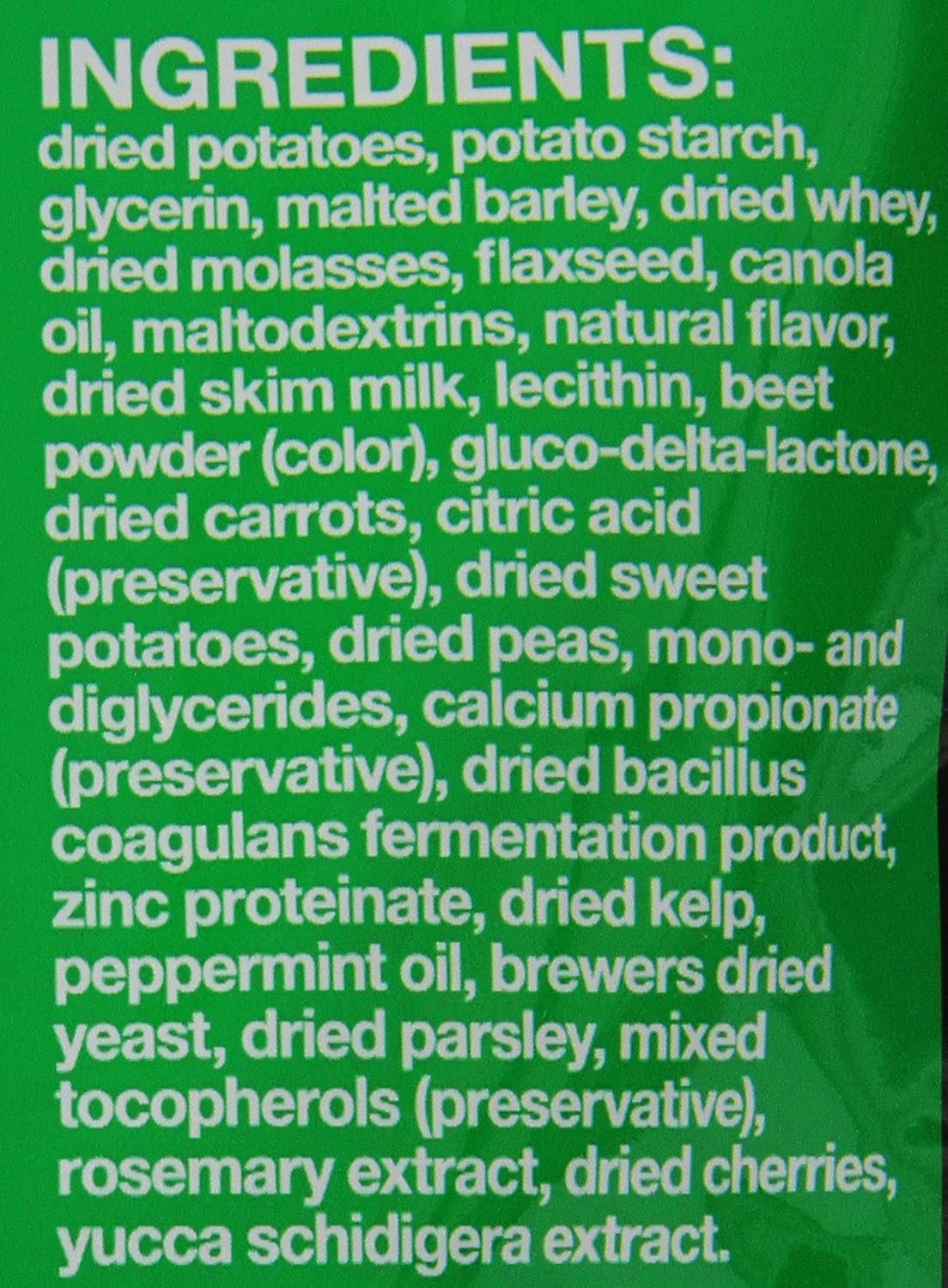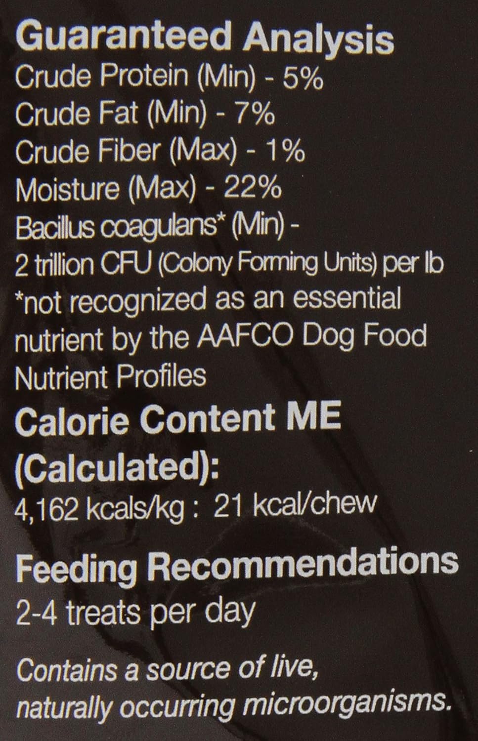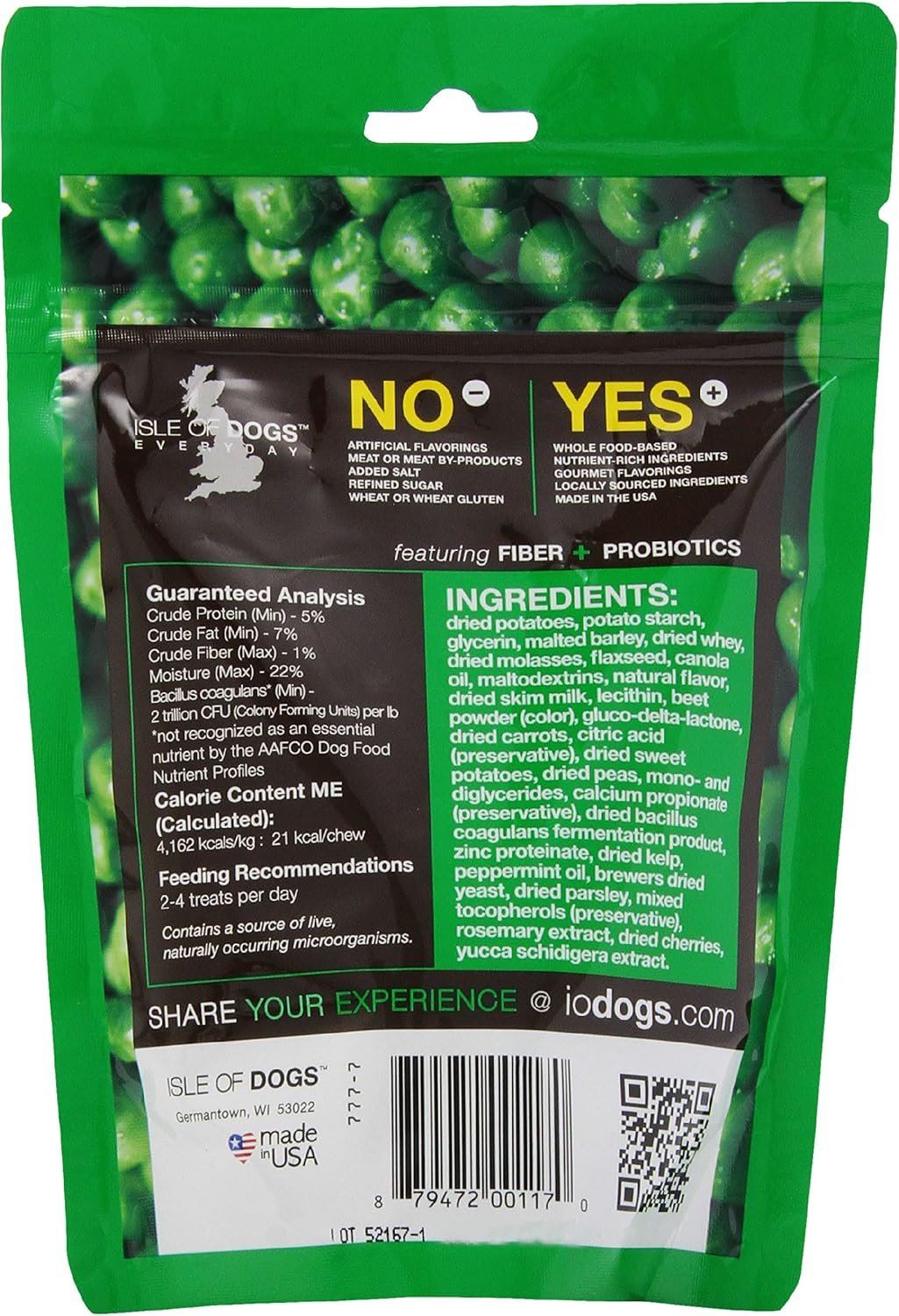You can feel good about giving your maturing dog our low fat Senior treat, which combines organic fiber rich peas and rolled oats with a patented strain of probiotics.