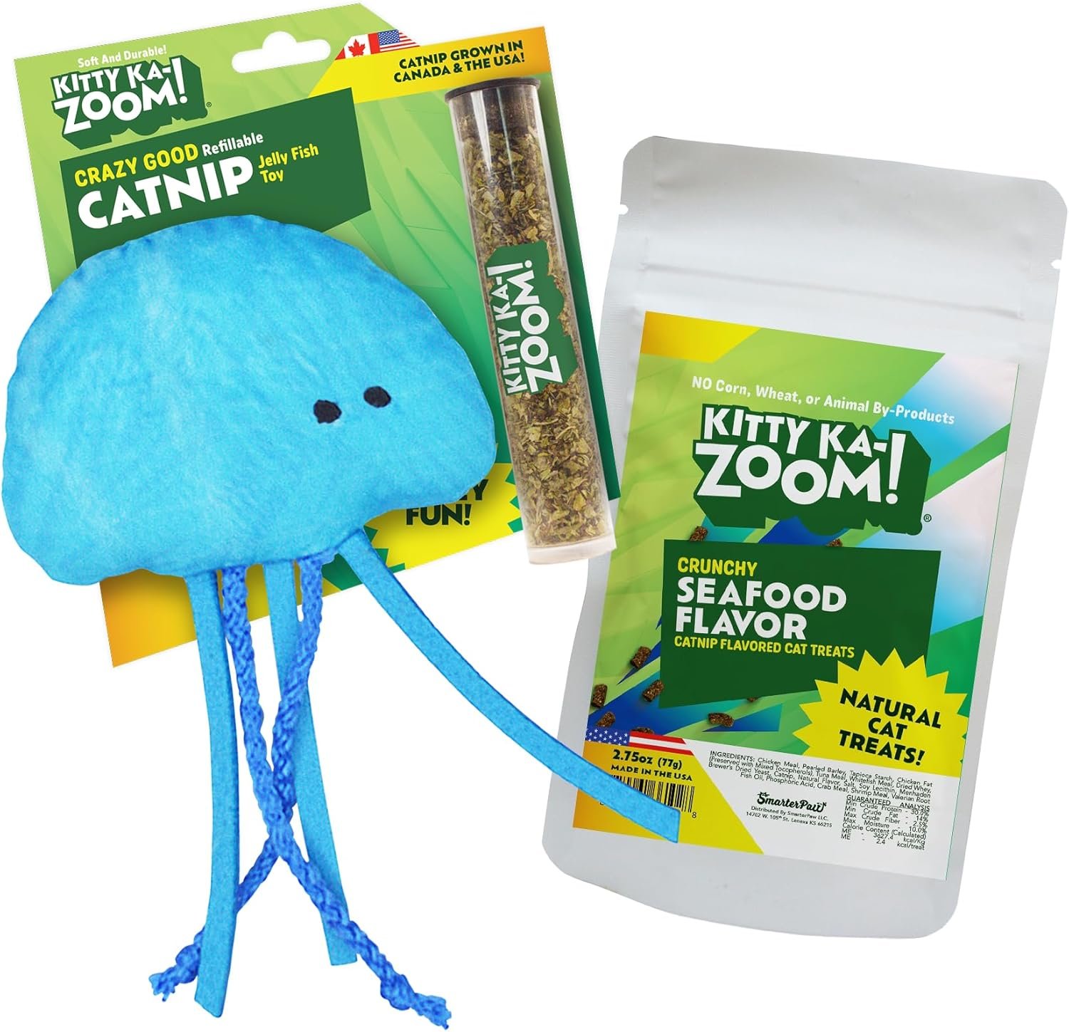 Jellyfish Toy and Seafood Treat Bundle for Cats | High Potency Hand Harvested Fresh Catnip | Soft Plush for Engaging Play | Low Calorie Carefully Crafted Treats
