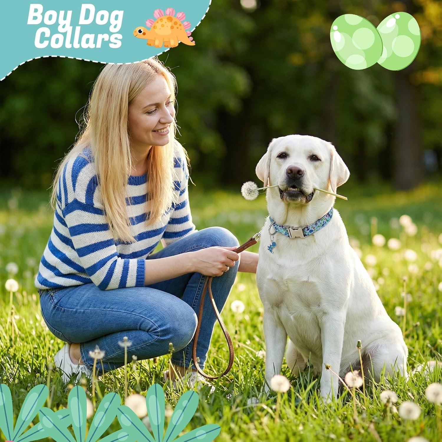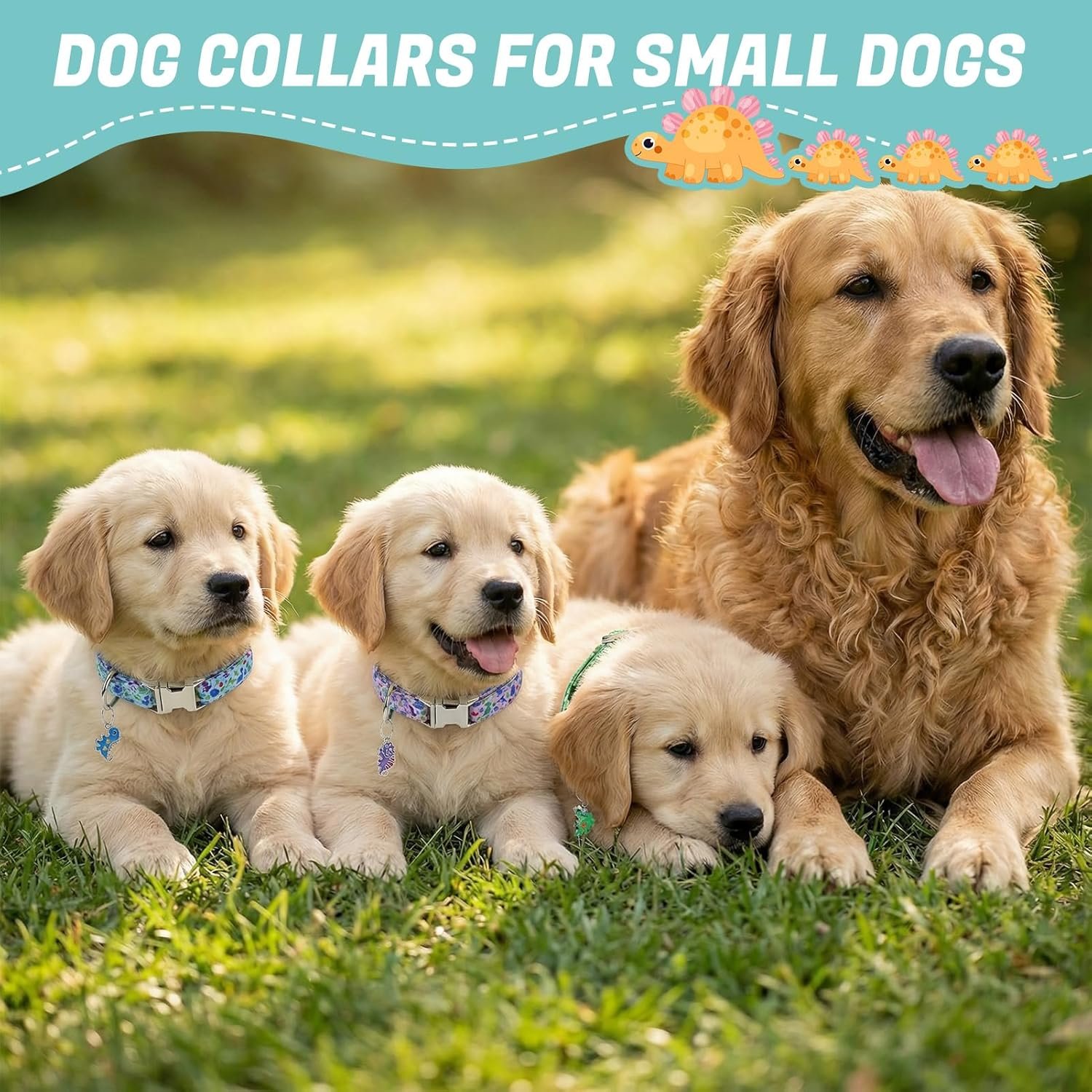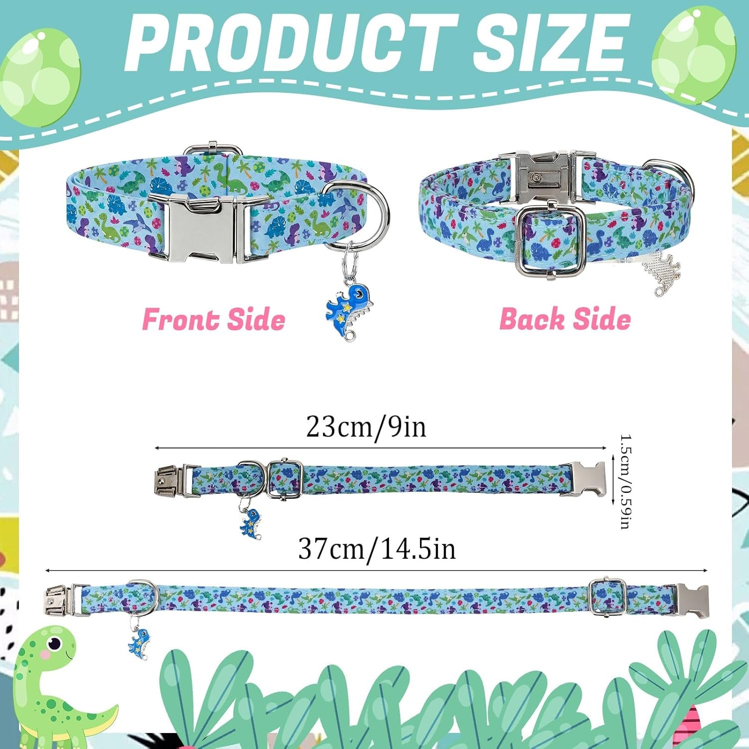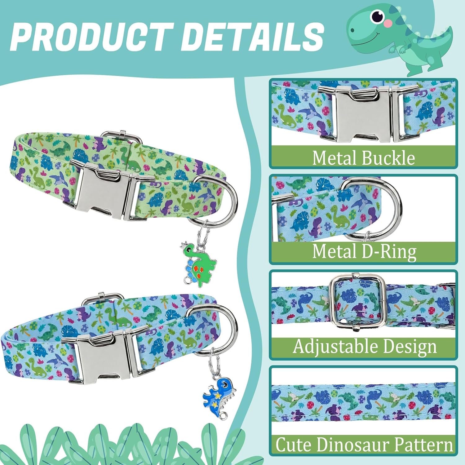 Dinosaur-Themed Design: Features playful dinosaur pendants and colorful blue, green, and purple patterns that create an eye-catching look for your puppy’s daily adventures