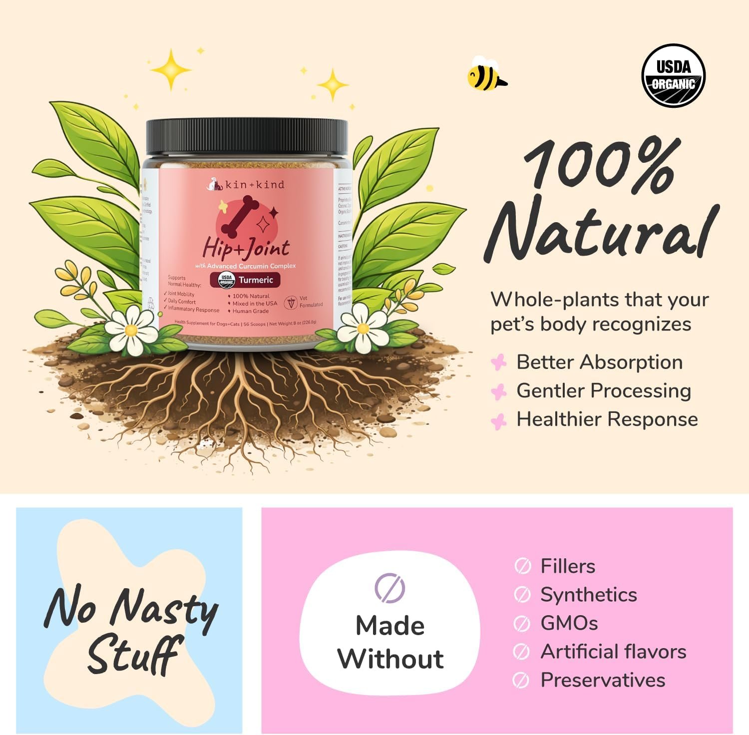 kin+kind Hip+Joint Supplement Dogs & Cats – Vet Formulated Natural Formula with Organic Turmeric, Black Pepper and Coconut – Made in USA – 226.8 g (Large)