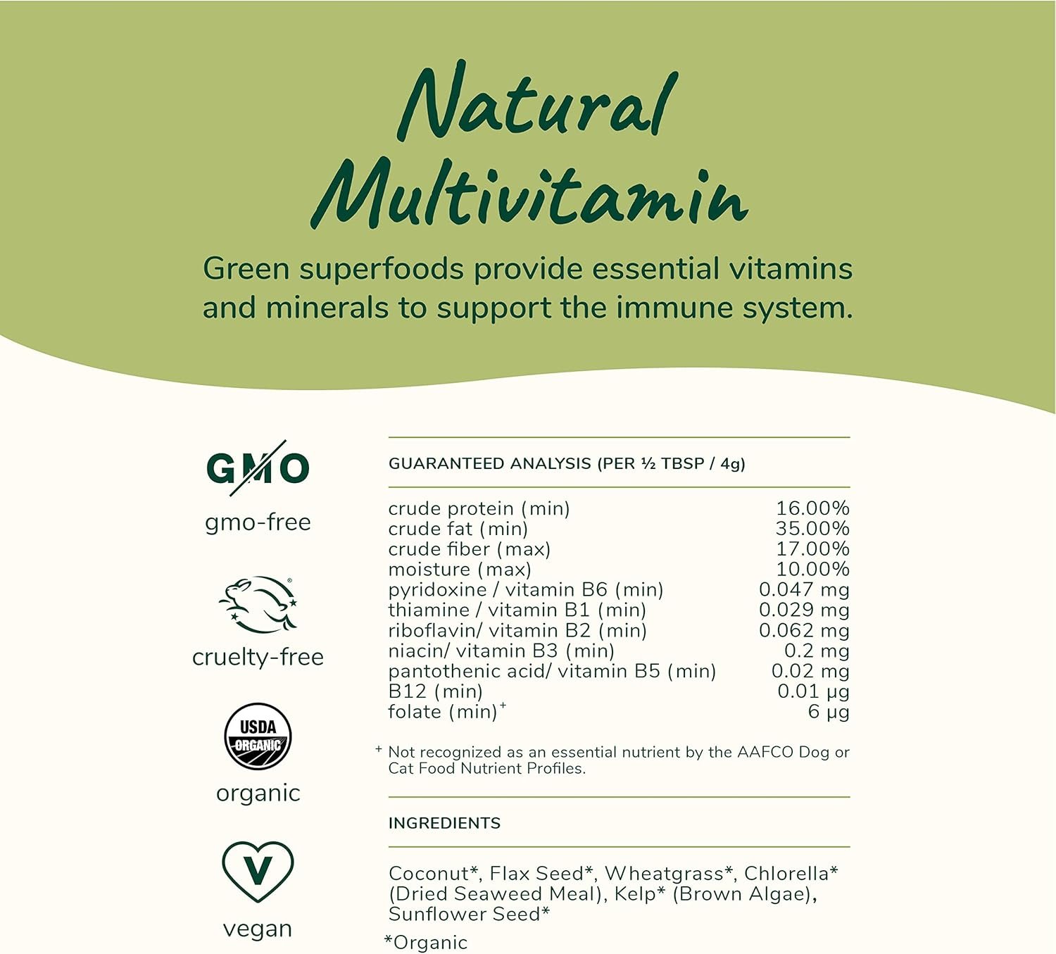 NATURAL VITAMIN: A powerful blend of supergreens like wheatgrass and seaweed that provide essential vitamins and minerals for healthy skin, coat, and energy levels. Our pet multivitamins contain all the necessary nutrients that dogs and cats need to thrive, making it the perfect choice for anyone looking for a high-quality multivitamin for dogs and cats.