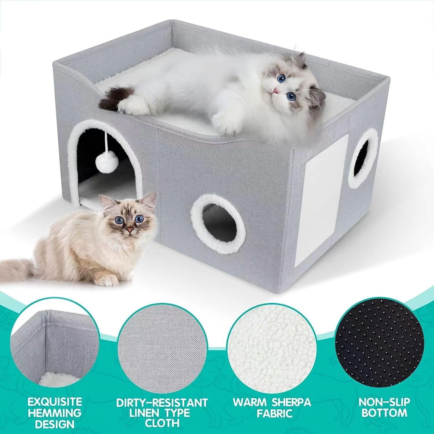 Large Cat House Indoor, Lavish Cat Cave Bed for Big Cats, Collapsible Hideaway with Scratching Area, Enclosed Cat Bed for Indoor Cats (Extended Gray, Large Size)