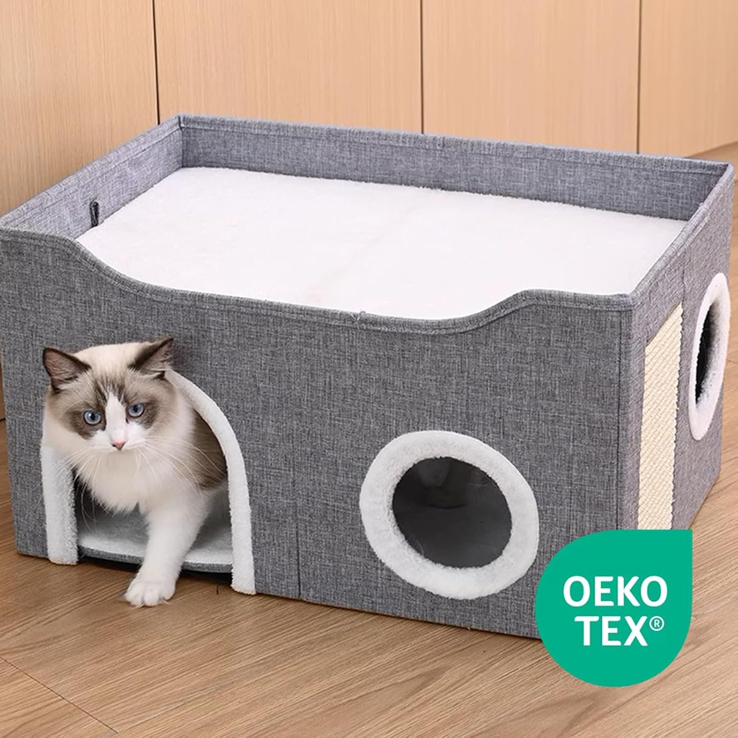 Spacious Cat House Indoor, Lavish Cat Cave Bed for Big Cats, Collapsible Hideaway with Scratching Area, Enclosed Cat Bed for Indoor Cats (Extended Gray, Large Size)