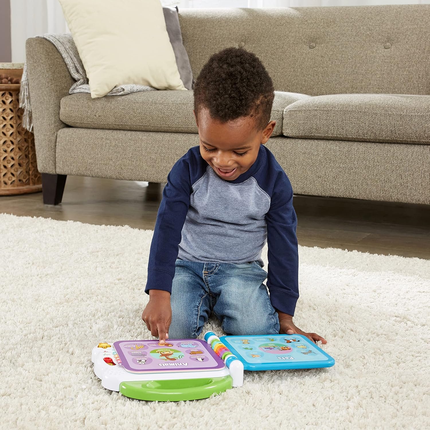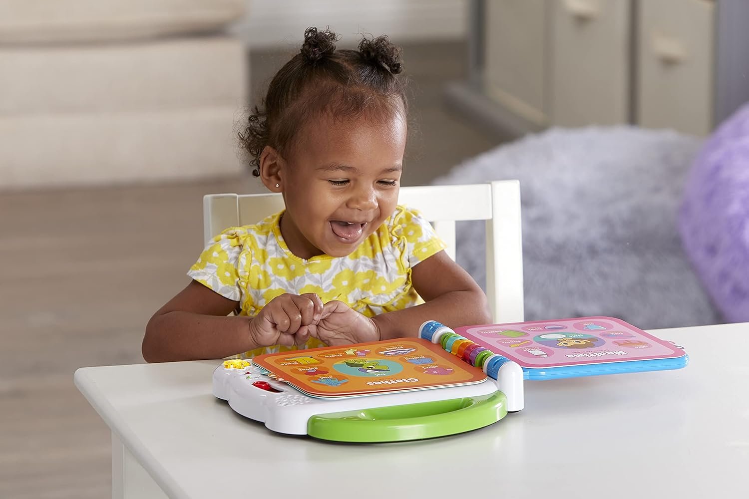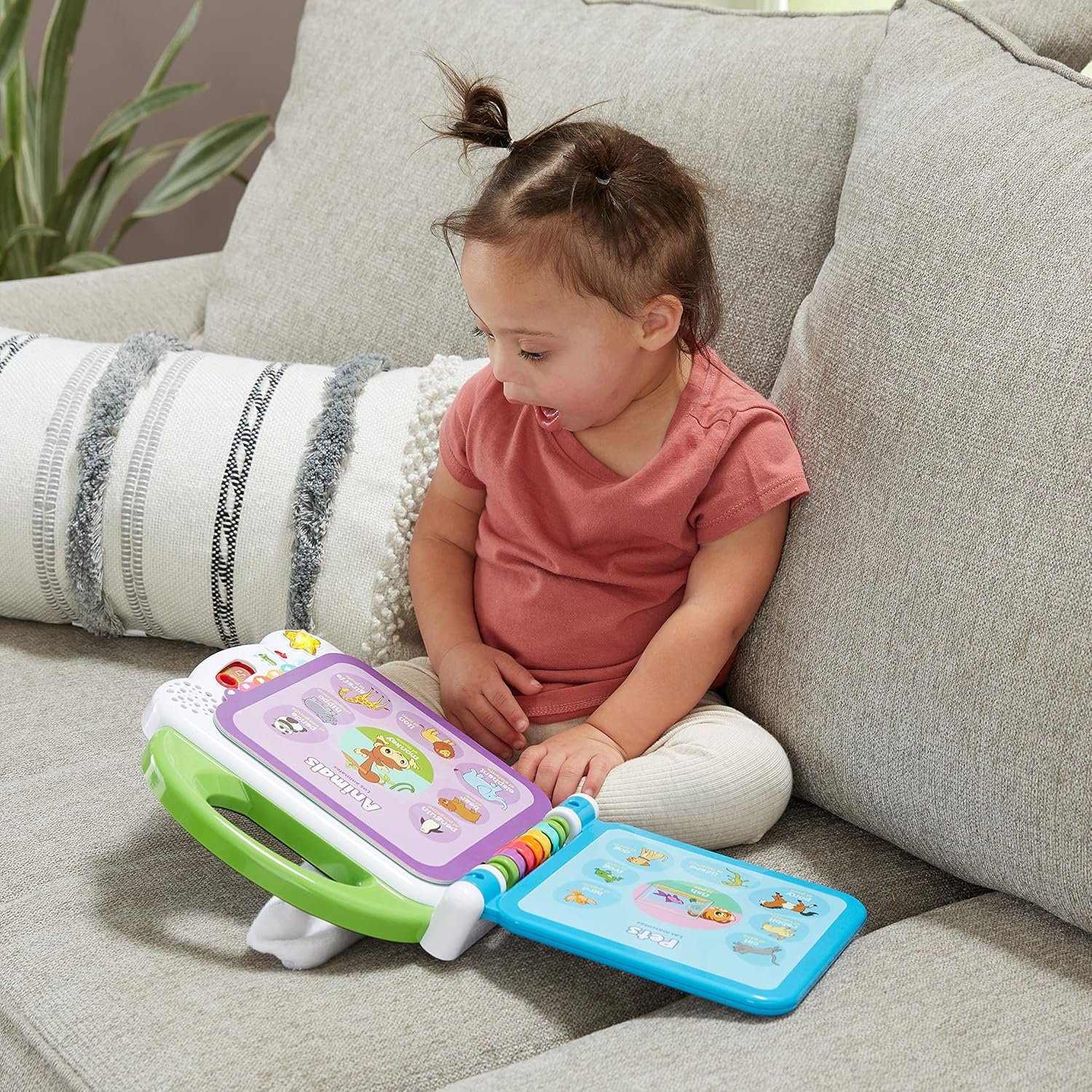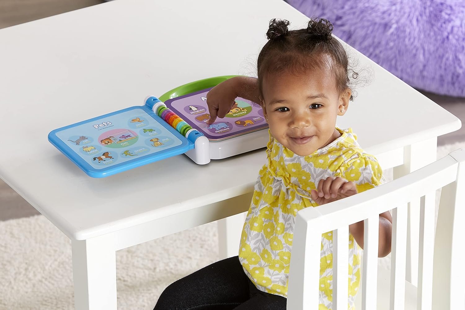 Join animal friends Turtle, Tiger and Monkey as they explore new vocabulary in the Learning Friends 100 Words Book. Explore the colorful pages and touch each picture to hear the animals say toddler-appropriate words along with exciting facts and sound effects. Immerse your child in bilingual play by sliding the language switch to hear the words, songs and instructions in French. Touch the pictures to hear silly sound effects in Fun Sounds mode or press the light-up star button to hear two learning songs. Discover new vocabulary with cute learning friends! Intended for ages 18+ months. Requires 2 AA batteries. Batteries included for demo purposes only. New batteries recommended for regular use.