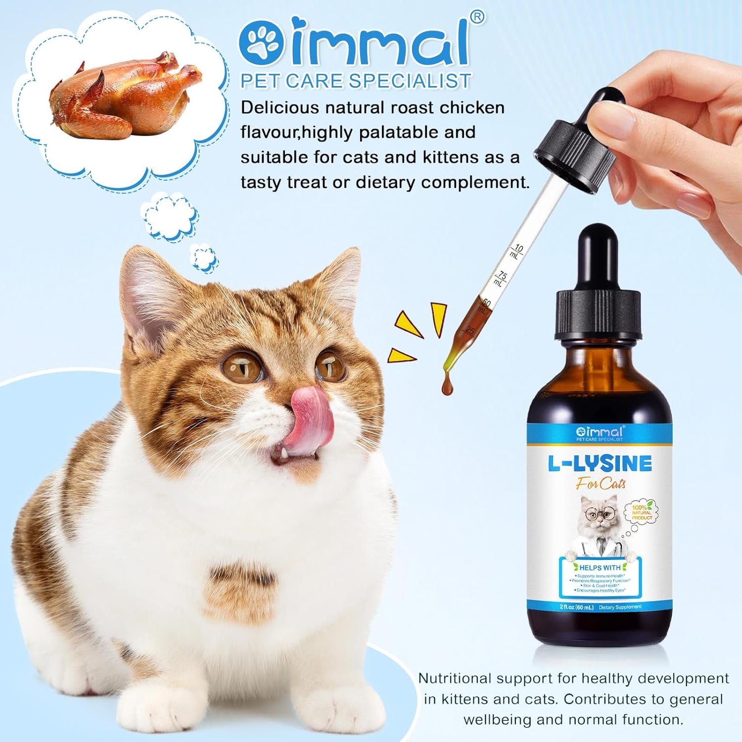 Easy to Administer: Our 60ml bottle of Liquid Lysine for Cats comes with Roast chicken flavor, making it easy to use and absorb, and a pleasure for your cat to take.