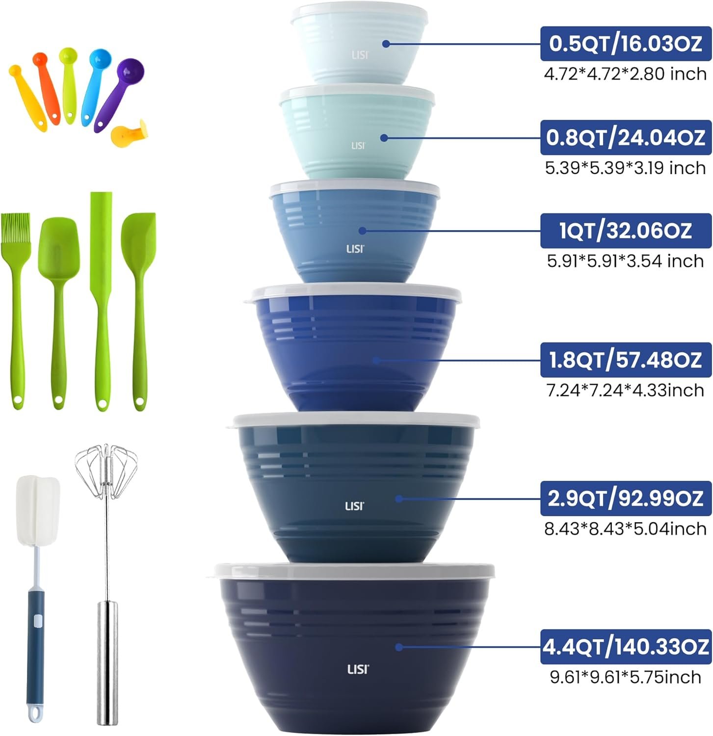 LISI 23Pcs Mixing Bowls Set with Lids, Airtight BPA-Free Nesting Bowls for Mixing, Baking, Cooking & Storage, Dishwasher Safe Serving Bowl, Includes Spatula, Spoons, Brush & Whisk