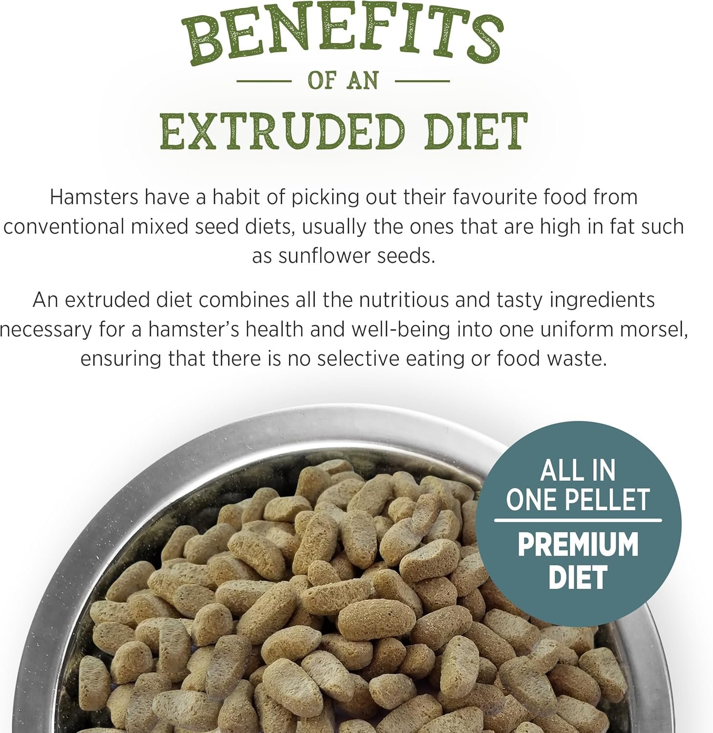 Living World guinea pigs extrusion diet is a premium, all-in-one diet that contains a blend of high quality, highly palatable ingredients to ensure guinea pigs receive a correctly-balanced meal. Guinea pigs have a habit of picking out their favourite food from conventional mixed seed diets, usually the ones that are high in fat, such as sunflower seeds. With Living World extrusion, there is no selective eating or food waste. Extrusion’s specially-balanced formula has all the protein, fibre, vitamins and minerals necessary to help keep guinea pigs healthy, including a soft, shiny coat and strong bones. The food comes in a stand-up bag with a resealable zipper to seal in freshness. Available in 1.3-pound bag.