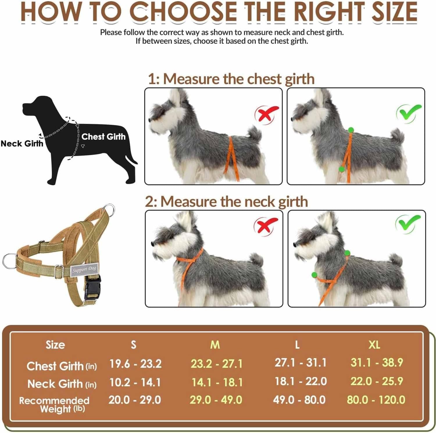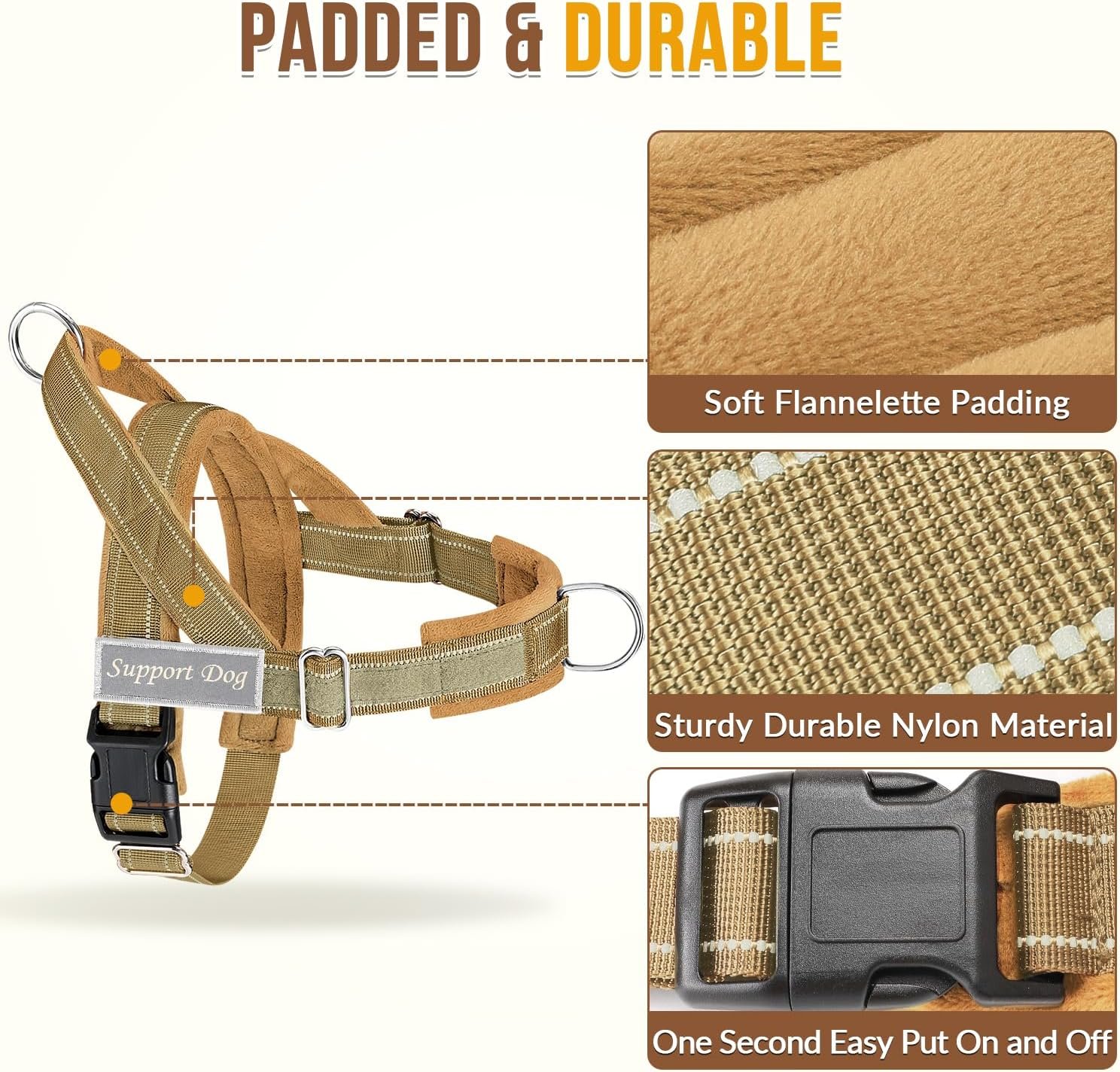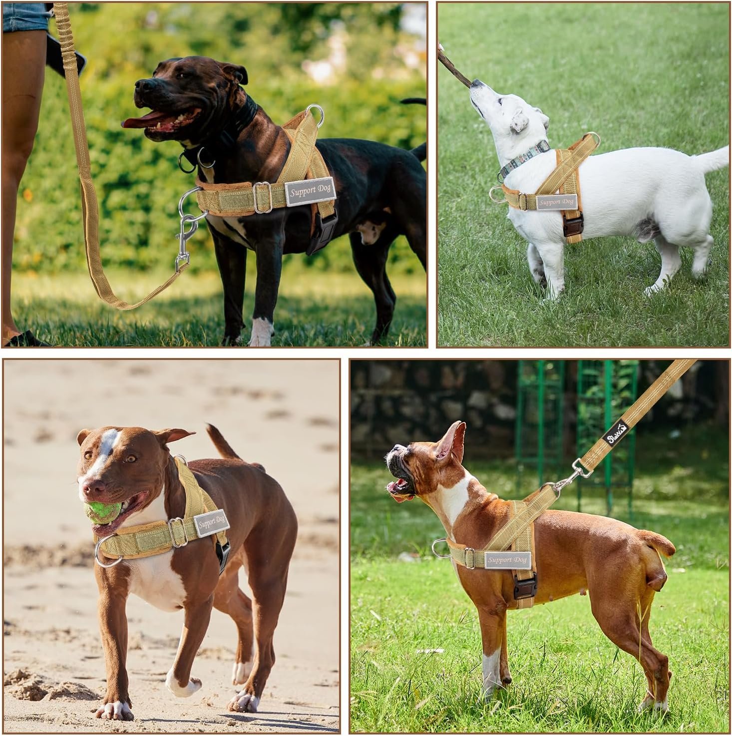 【Tangle-free Leash & Reflective】— A heavy-duty 360° swivel hook prevents tangles. The leash includes an elastic bungee, two padded handles, and bright reflective strips for safe walking day or night. It also comes with two straps: a regular “Support Dog” and a reflective “DO NOT PET.”