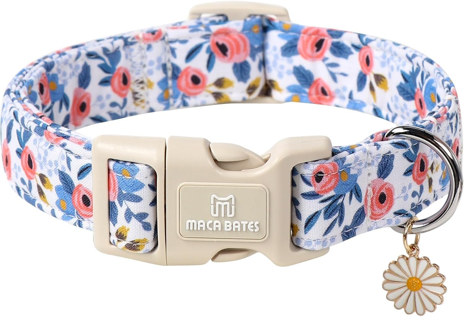 Maca Bates Blue Flower Dog Collar for Small Girl Boy Dogs with Daisy Charm,Blue Floral Pattern,Soft Adjustable Durable Cute Soft Comfortable Gift Collars for Male Female Puppy with Safety Buckle