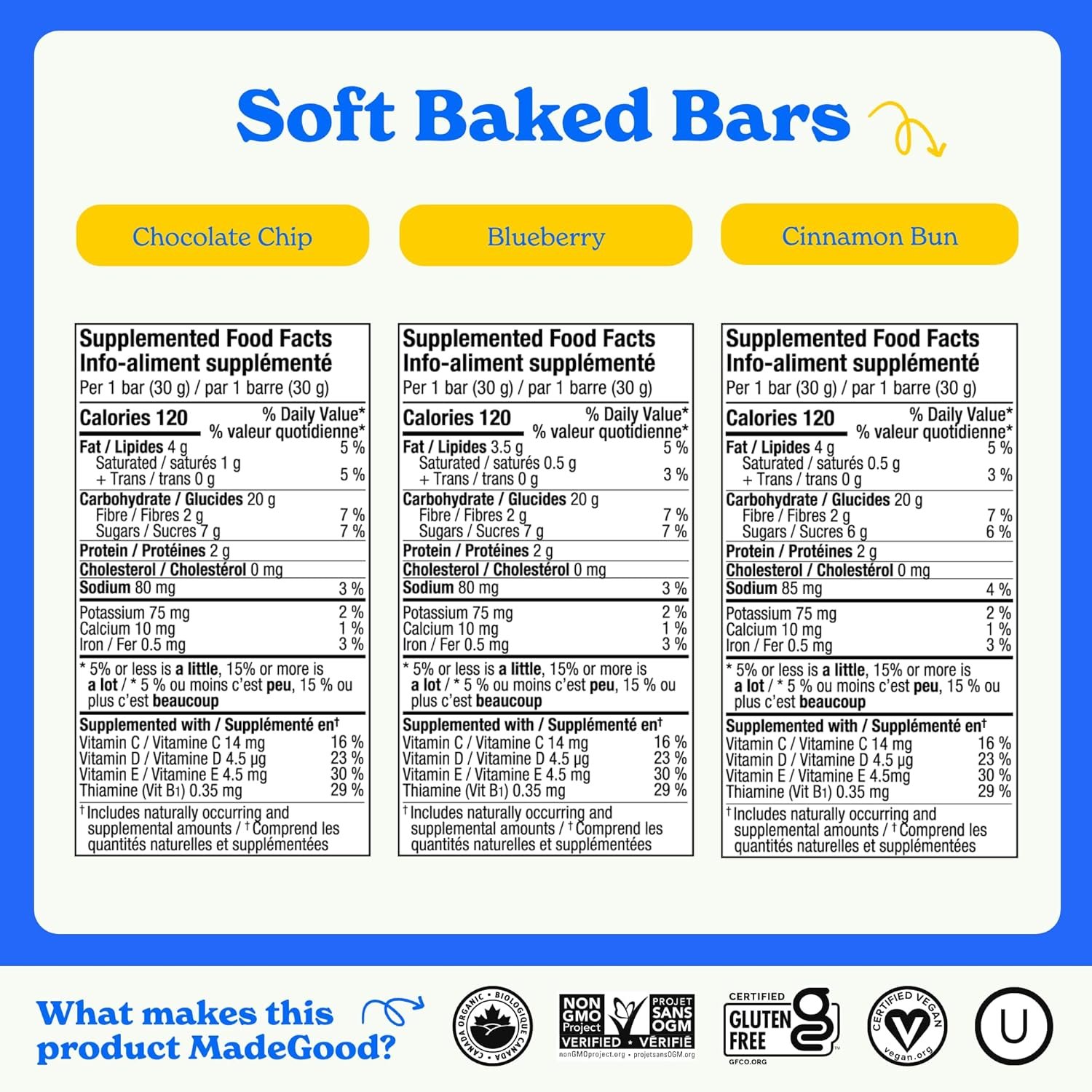 CONTAINS: 30 individually wrapped MadeGood Morning Soft Baked Breakfast Bars (1.06oz Each). 10 Chocolate Chip, 10 Blueberry, 10 Cinnamon Bun.
