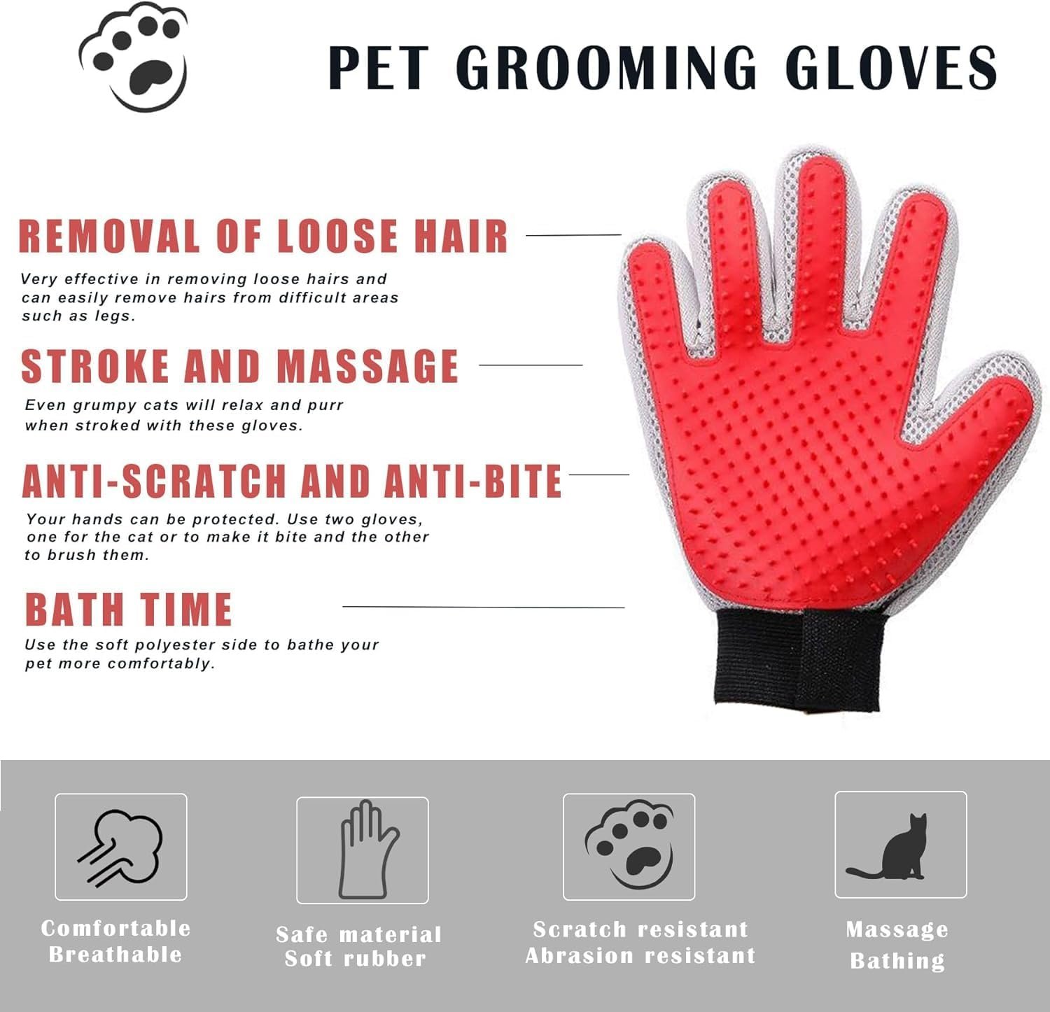 【Wet Or Dry Use】 This glove can not only Grooming, massage,remove hair, but also can be used in the bath to deeply clean dirt, dander and loose hair on cats and dogs.