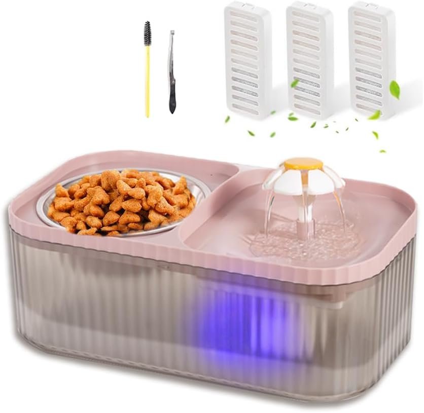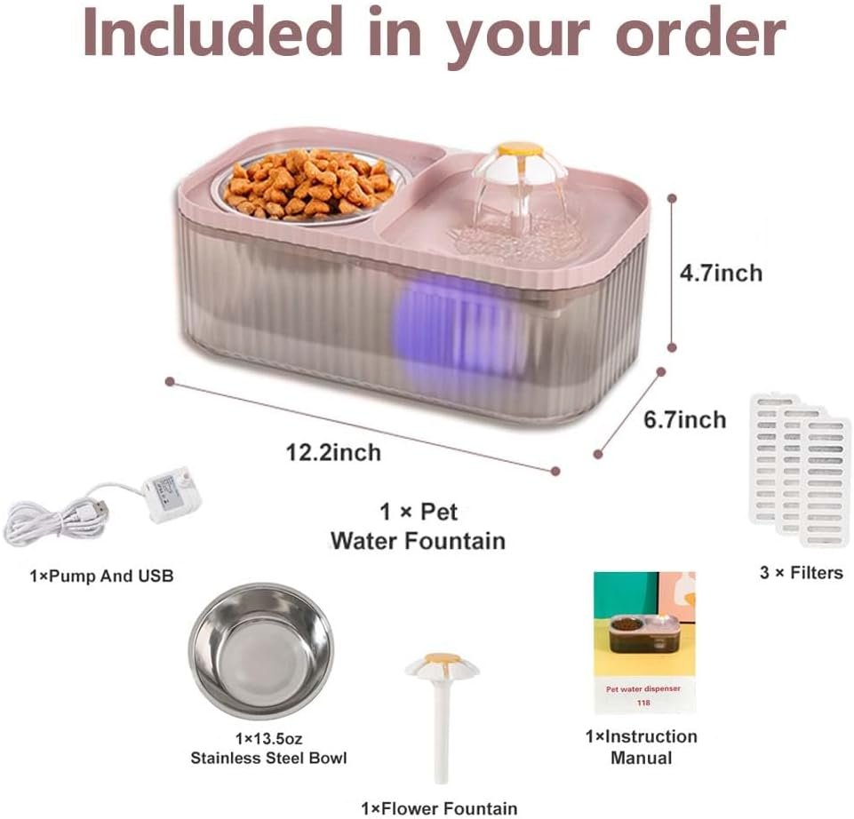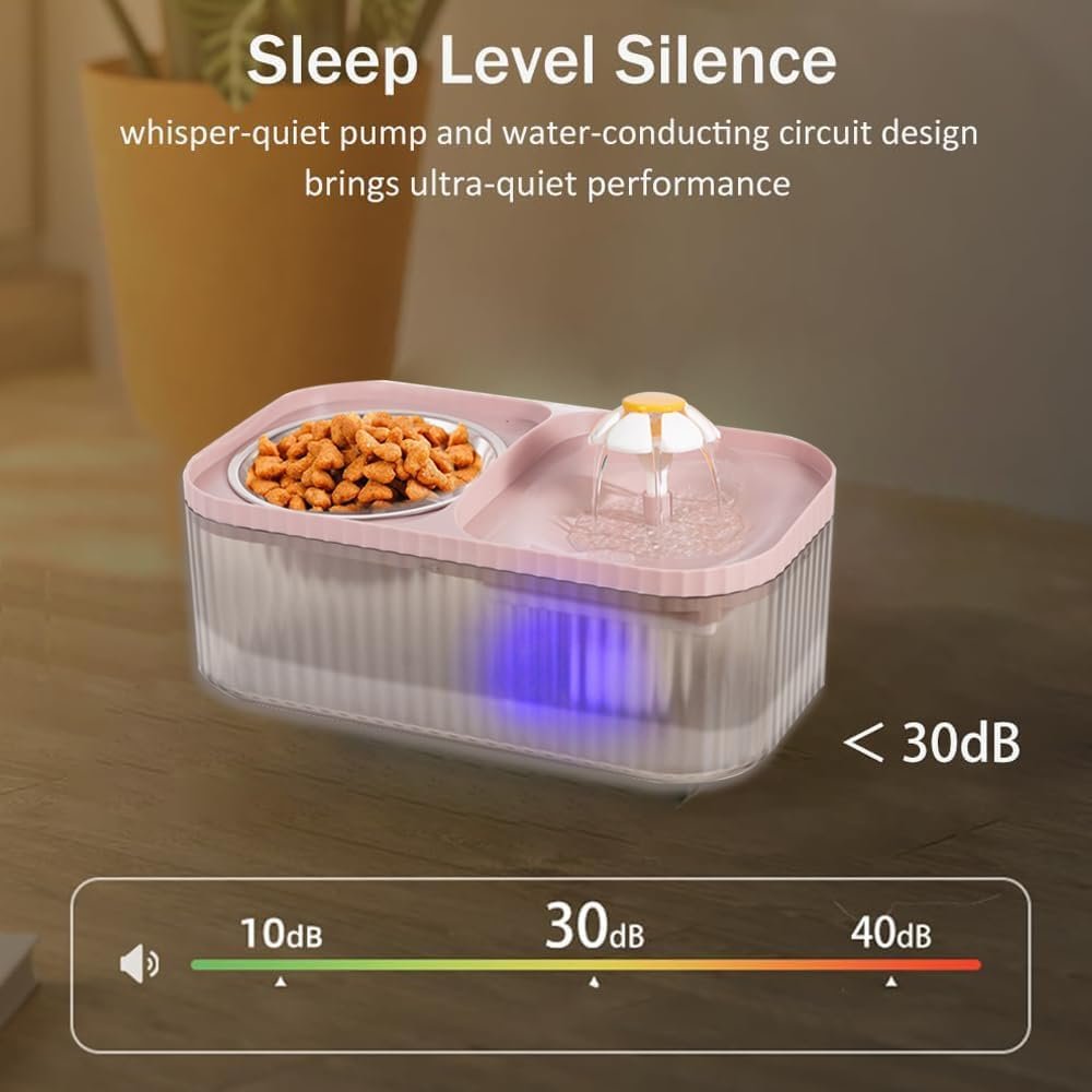 2 In 1 Cat Water fountain: Our 2-in-1 pet water fountain and food bowl features a unique and thoughtful design. It share the same base, but with isolation design to prevent food from entering the water fountain, avoiding dirty water or blocked water flow that may cause leakage. The 15-degree elevated design also reduces spinal pressure and makes feeding and drinking easier and healthier for your furry friend