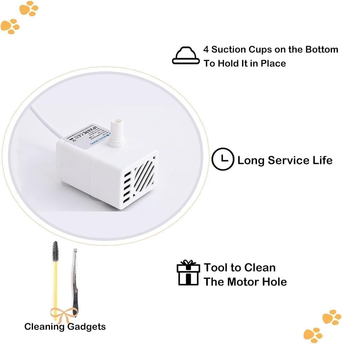 Super Quiet: With a water pump that measures less than 38 decibels, our pet water fountain is incredibly quiet, ensuring you and your pet are not disturbed by any unwanted noise