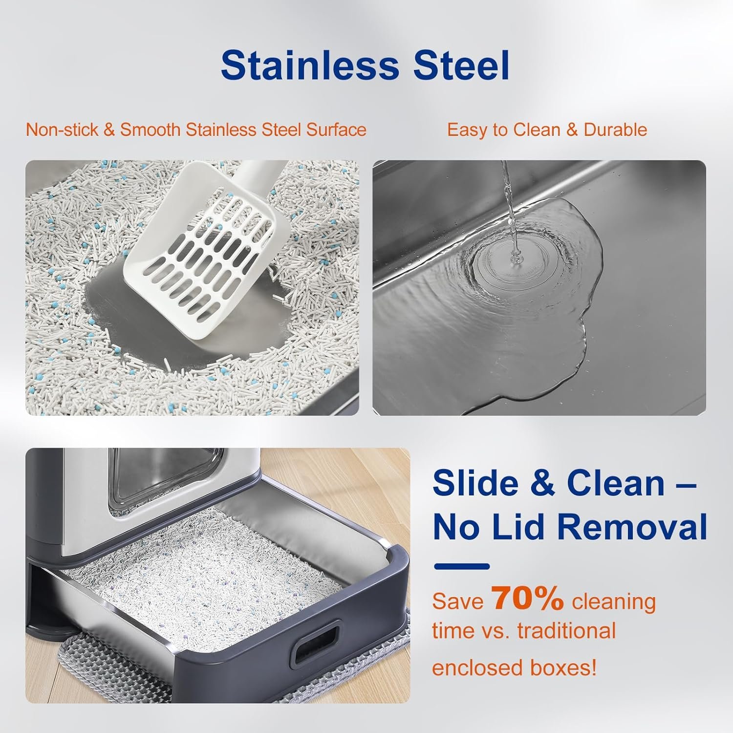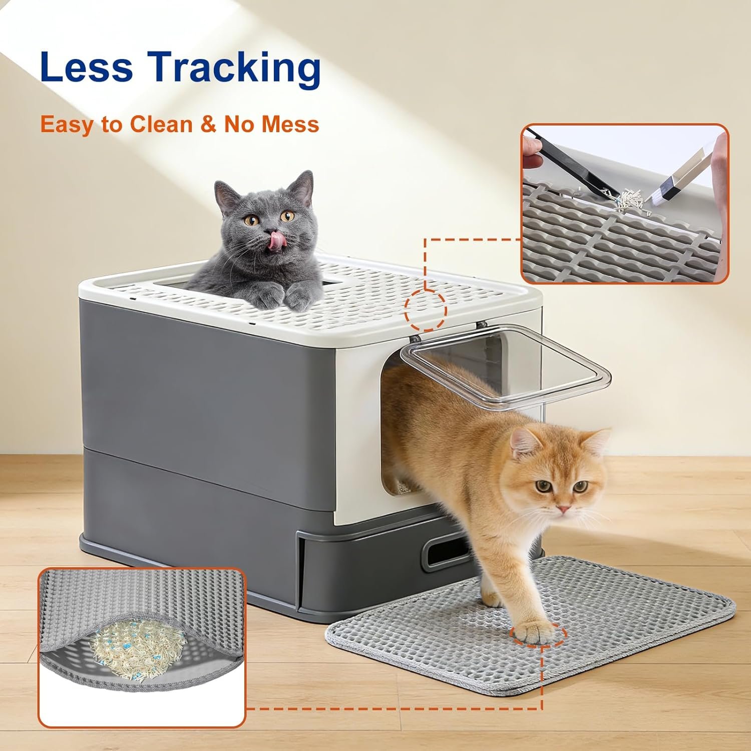 Saving 70% Cleanup Time: Slide-out drawer allows you to simply pull it out in daily life to clean up cat litter, and upgraded with a leak-proof base panel securely contains scattered cat litter, no more litter spills on your floor. Dual-layer EVA litter mat blocks 99% of tracked-out cat litter