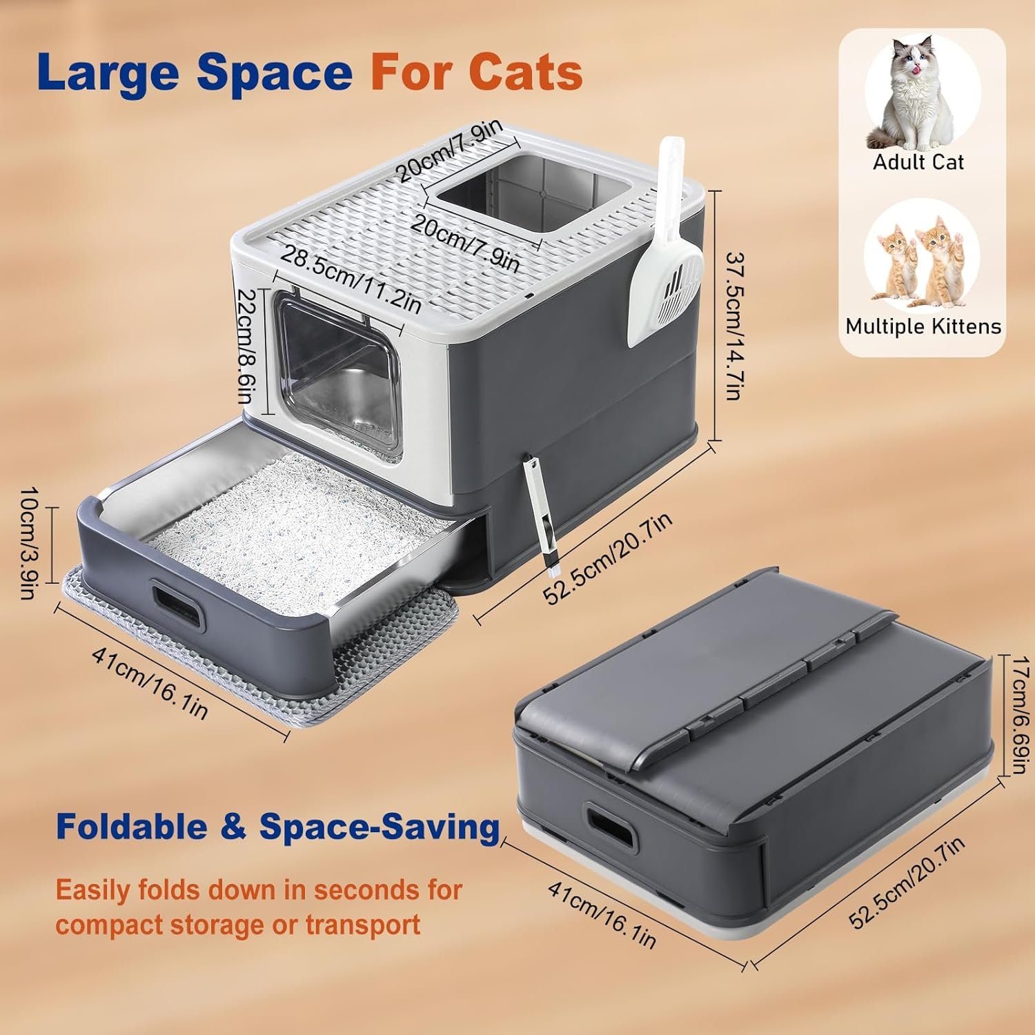 Spacious Dimension Design: roomy interior allows cats to enter, exit and turn around with total ease, perfect for large cats to use the litter box comfortably. Overall: 20.7″L × 16.1″W × 14.7″H | Front Entrance: 11.2″L × 8.6″W | Top Entrance: 7.9″L × 7.9″W.