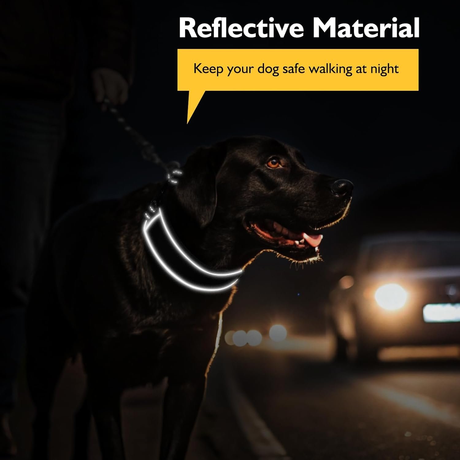 Reflective Dog Pull Collar: Our reflective dog walking collar ensures your dog stays visible and safe during nighttime walks, even if your pup is completely black! The reflective stitching glows in low light and reflects car headlights or streetlights, making your dog easy to spot by cars and pedestrians. Perfect for peace of mind when walking your dog at night!