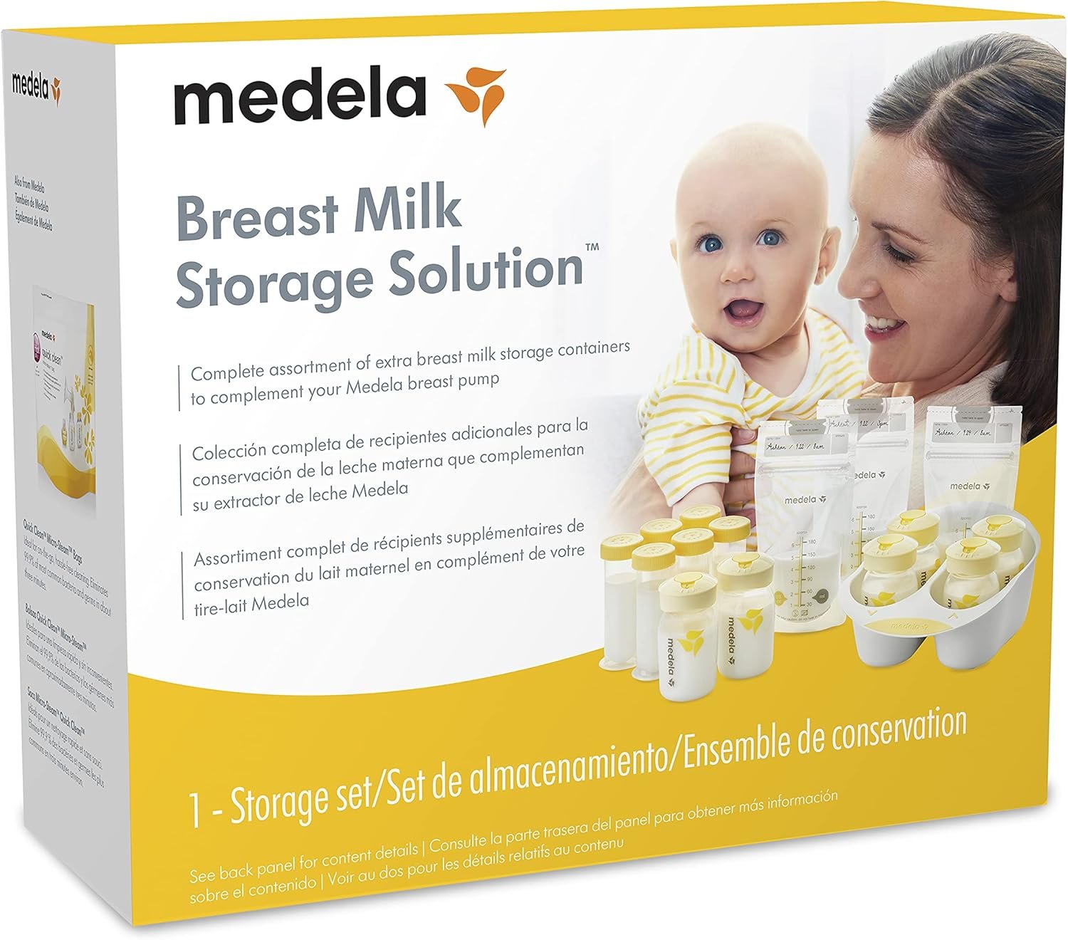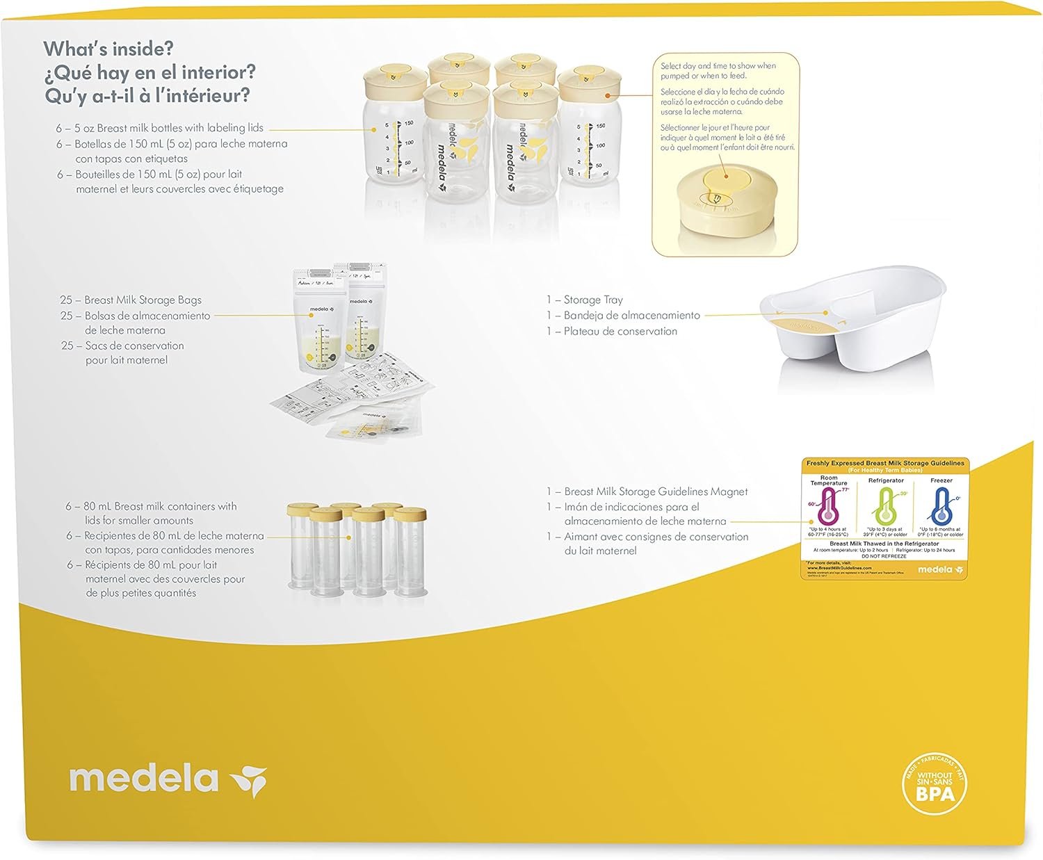 Medela’s breast milk storage solutions set is the perfect complement to any Medela breast pump, and makes for a great registry or gift item. As our complete system of breastfeeding supplies, each product included is designed to address your needs as a breast milk feeding mom and your baby’s changing requirements as he or she grows and develops through the length of your breastfeeding journey. The breast milk storage solutions set allows you to easily and conveniently store, organize, and protect your breast milk, so you always know what bottles to feed next, the amounts that you’re pumping, and how much your little one is consuming. What’s Included: (6) 5-Oz./ 150 mL breast milk bottles; (6) 2.7-Oz./ 80 mL breast milk bottles and lids; (6) labeling lids; (25) 6-Oz./ 180 mL breast milk storage bags; (1) Storage tray; (1) Breast Milk Storage Guidelines magnet All breastfeeding supplies in this set – including the breast milk bottles, labeling lids, and breast storage bags – are compatible with all Medela breast pumps and are ideal for short-term and long-term storage. The complete system allows you to safely store, organize, and protect your breast milk throughout your breastfeeding experience. Convenient, ready-to-use breast milk storage bags are constructed from a durable, double layer material and built-in double zipper seal to keep your breast milk safely stored in the fridge or freezer. Please note that plastic bottles and component parts become brittle when frozen and may break when dropped. Also, bottles and component parts may become damaged if mishandled, dropped, over-tightened, or knocked over. Take appropriate care in handling bottles and other components. Do not use breast milk if bottles or components become damaged. QuintilesIMS ProVoice Survey; November 2016 – October 2017.