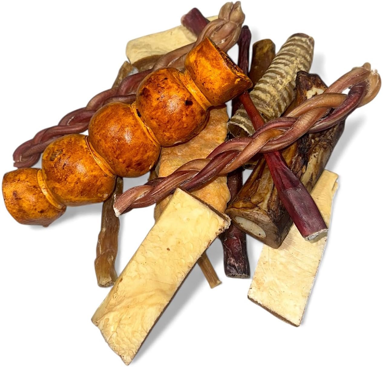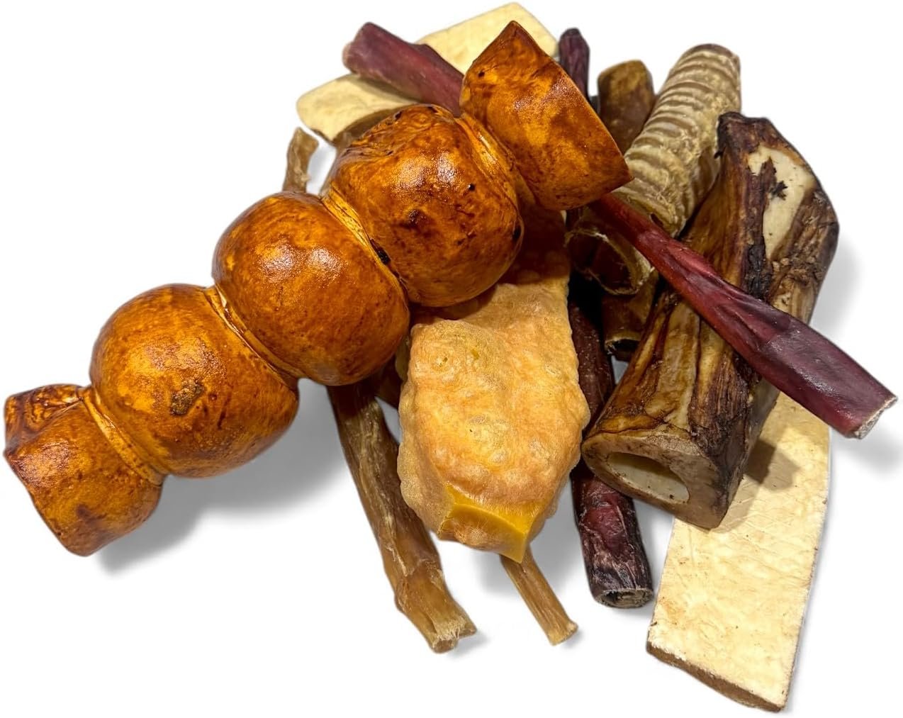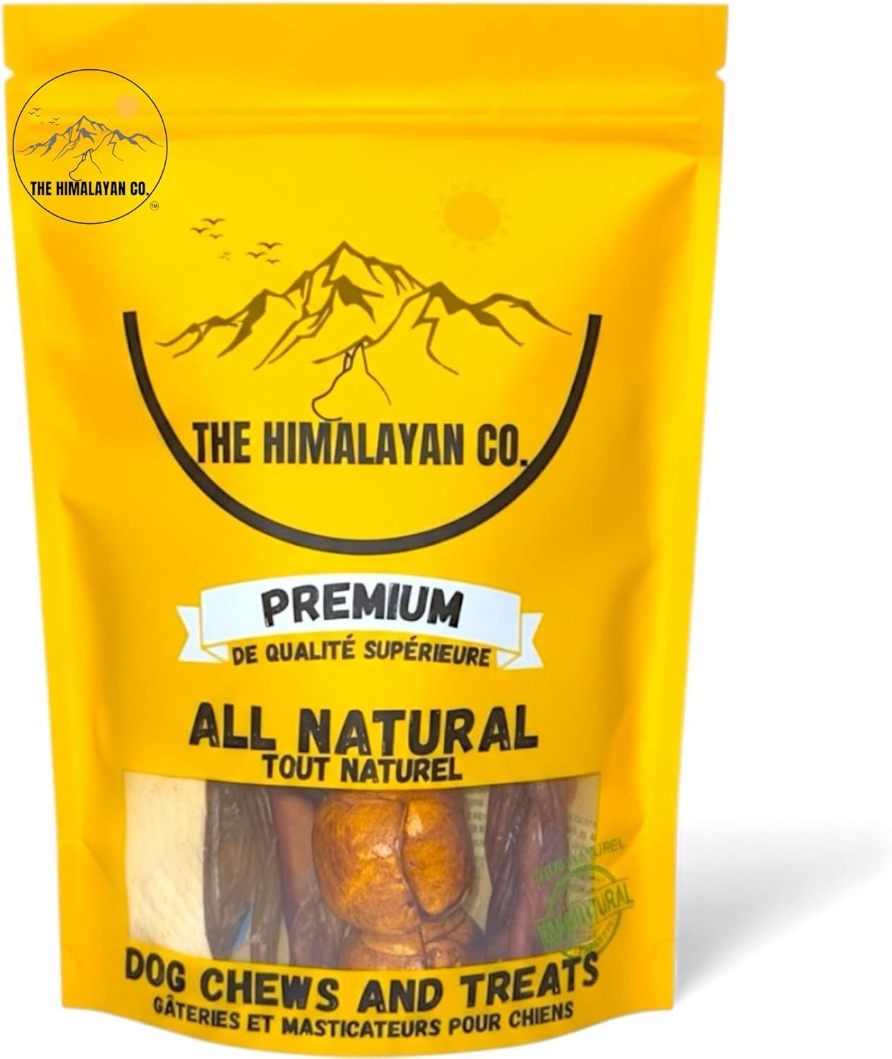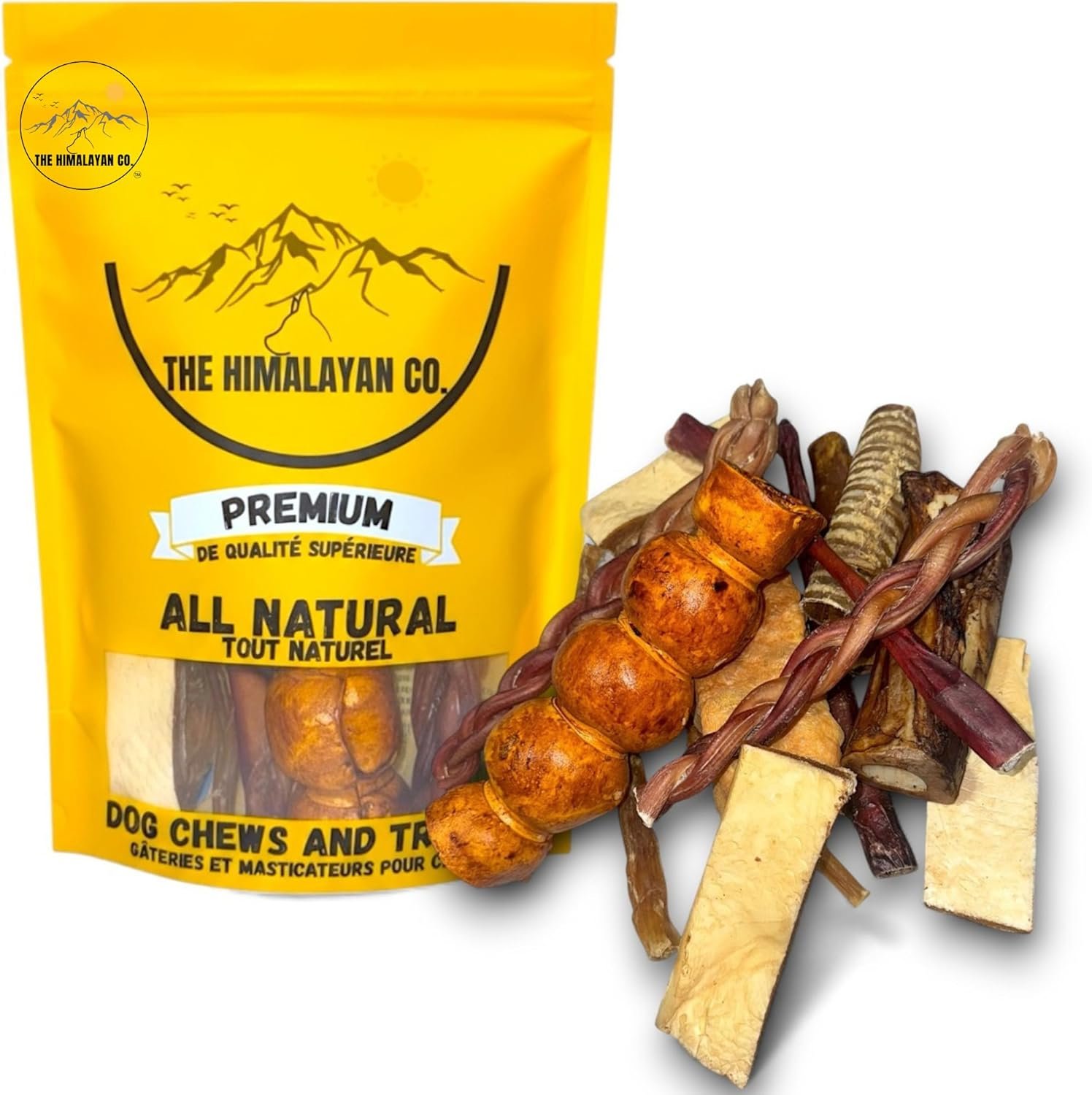 THE HIMALAYAN CO. MEGA MIX CONTAINS A VARIETY OF CHEWS AND TREATS SUCH AS: Bully Sticks, Pig Ears, Cow Ears, Himalayan Yak Chews, Beef Trachea, Beef Cheek Rolls, Beef Cheek Strips, Collagen Sticks, Marrow Bones, Knuckle Bones, Beef Hooves and much more. All bags are different but have a fantastic variety of all natural chews and treats your dog will go crazy for!