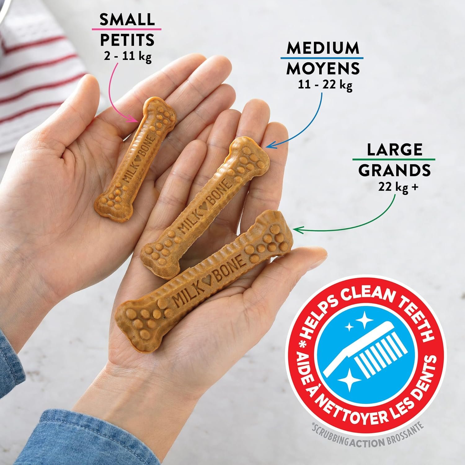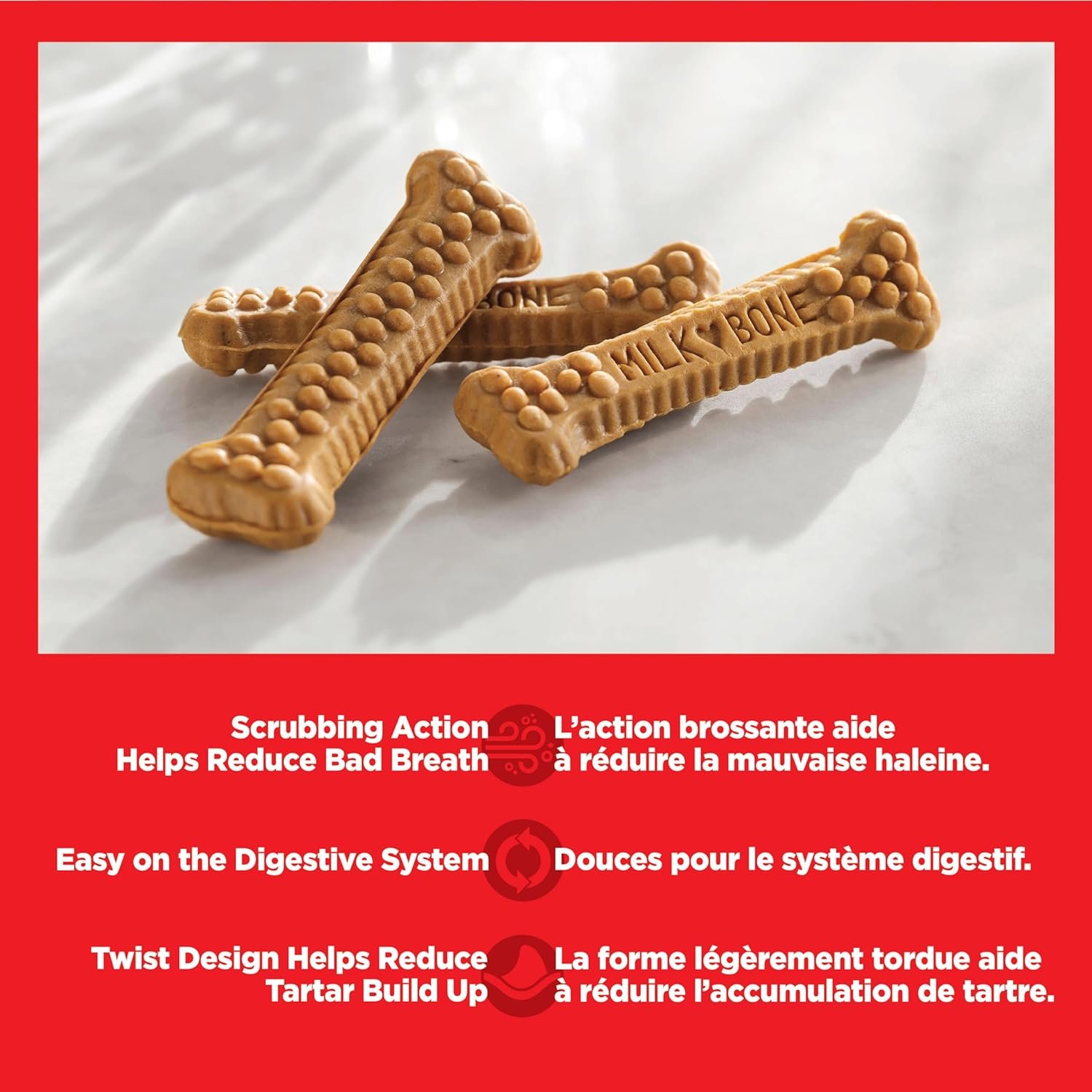 Tastes like a treat, cleans like a toothbrush. Milk-bone brushing chews daily dental dog treats are clinically proven as effective as brushing.The perfect daily dog chew treat to reward your dog’s morning kisses. Brushing Chews dental sticks are proven as effective as brushing, with calcium to help keep teeth and bones strong. Clinically shown to help to reduce tartar build up and freshen breath through scrubbing action, Brushing Chews bone shaped dental chews feature nubs & ridges designed to clean like bristles on a toothbrush, supported by a twist design that helps clean even hard to reach back teeth and down to the gumline. Chicken flavoured with no artificial flavours and fortified with 12 vitamins and minerals, including calcium to help support strong bones and teeth. *When fed daily, Milk-Bone Brushing Chews dental dog treats are as effective as brushing a dog’s teeth twice a week based on the reduction of tartar build-up and bad breath. The Veterinary Oral Health Council (VOHC) recommends daily tooth brushing for optimal effectiveness.