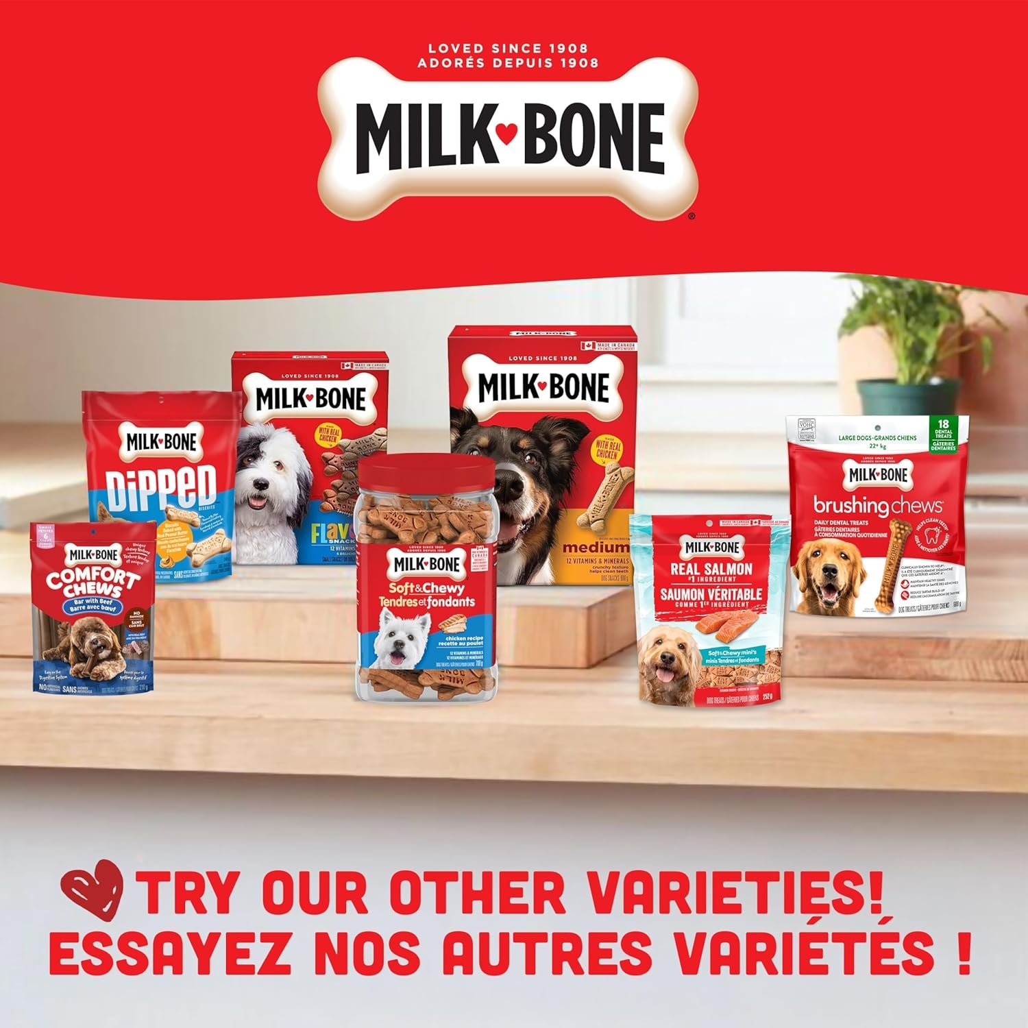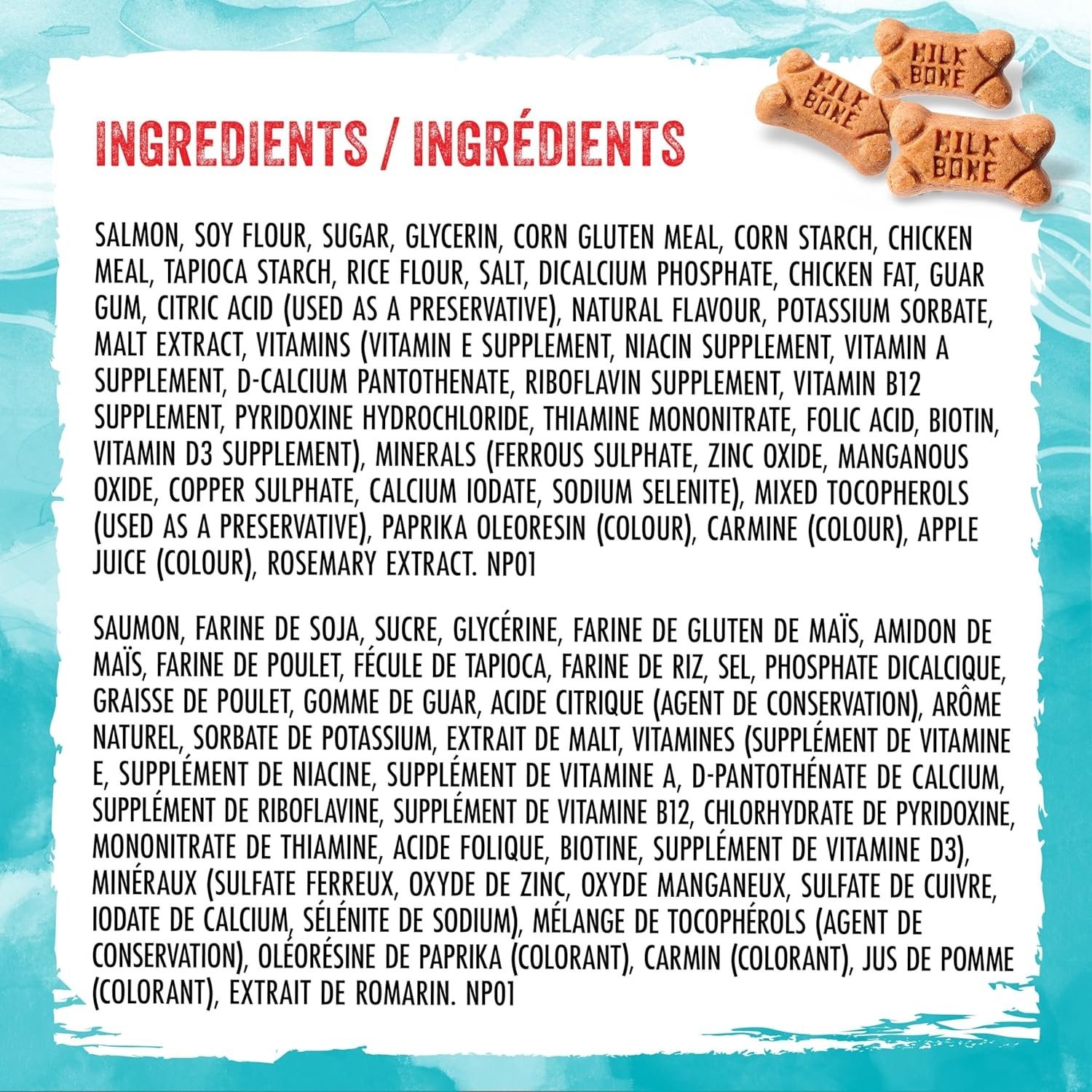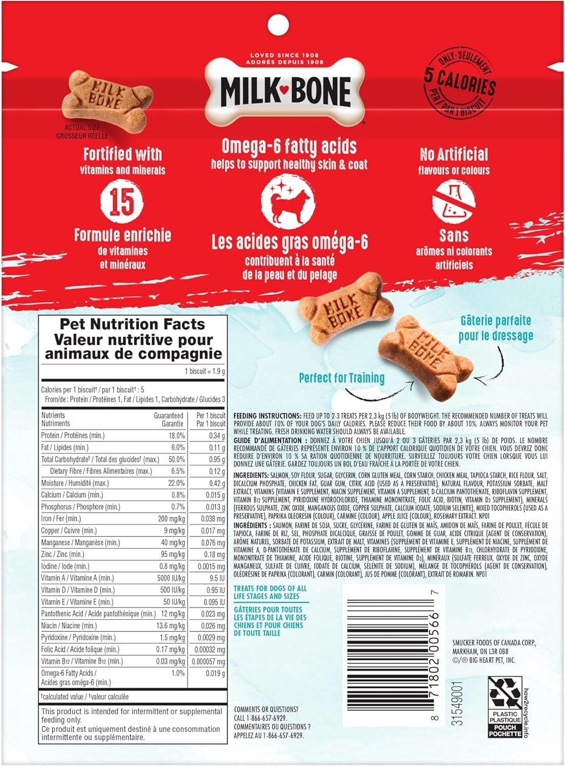 Milk-Bone Salmon Recipe Dog Treats are made with Real Salmon as the #1 ingredient and contains Omega-6 fatty acids to help support your Dog’s healthy skin & coat. Having only 4 calories per treat, this easy to chew, mini bone shaped biscuit is perfect for treating or training anytime, anywhere. Fortified with 15 vitamins and minerals and contains no artificial flavours or colours, this Dog Treat is for Dogs of all sizes and life stages; a mini soft biscuit made with real salmon to make your dog feel special!