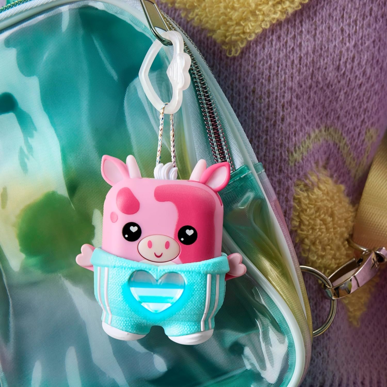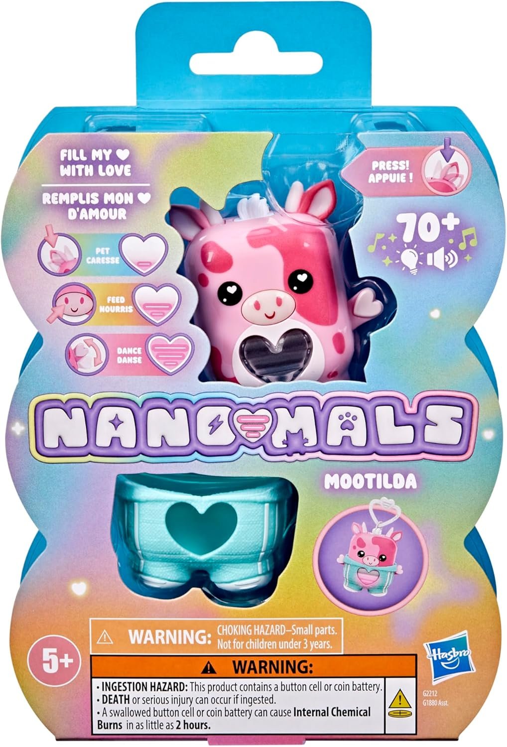 Unlock a world of fidgety, fashionable pocket-sized pets with Nano-mals Mootilda the pink cow. Nano-mals are electronic fidget toys and adorable mini companions that need your love! Each Nano-mals character has a color-changing heart meter that kids can fill in so many fun and satisfying ways. When Mootilda’s heart meter drops, she’ll make sounds to let you know she needs care. If her heart meter is blue, she needs pets, so press her ears. If her heart is orange, she’s hungry — press her mouth to pretend feed her. Is her heart pink? Click her arms up and down to make her dance. What about purple? She wants to move! Flip, catch, or shake to fill her heart. Mootilda will celebrate her full heart with a song and colorful lights show. Give Mootilda some extra flair with a textured snap-on teal outfit. Plus, she comes with an attached clip, so she makes a great kids keychain. Nano-mals are the perfect gift for kids who love animal toys, digital pets, and fidget toys. Nano-mals and Hasbro and all related trademarks and logos are trademarks of Hasbro, Inc.