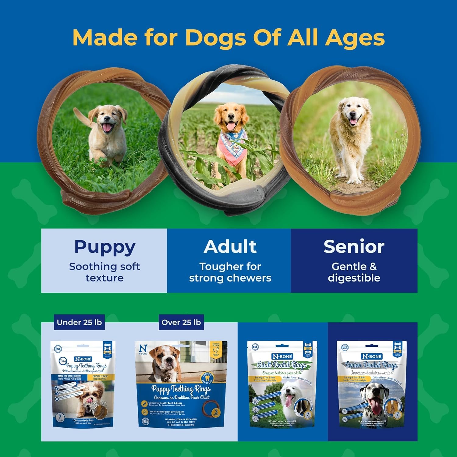 Growing new teeth is tough work Sore gums and a strong urge to chew while cutting new teeth can turn your precious puppy into a whirlwind of destruction. N-Bone Puppy Teething Rings are easy for floppy puppy paws to hold onto and provide a soothing and appropriate outlet for chewing. Formulated with DHA and calcium to support your puppy’s unique nutritional needs, our delicious chicken flavored rings are pliable and won’t damage immature teeth.
