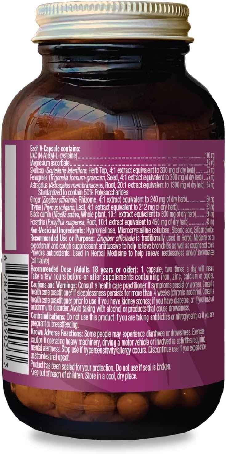 NAC (N-Acetyl-L-cysteine) – 100 mgMagnesium ascorbate – 85 mgSkullcap (Scutellaria lateriflora, Herb Top, 4:1 extract equivalent to 300 mg of dry herb) – 75 mgFenugreek (Trigonella foenum-graecum, Seed, 4:1 extract equivalent to 300 mg of dry herb) – 75 mgAstragalus (Astragalus membranaceus, Root, 20:1 extract equivalent to 1300 mg of dry herb) – 65 mg Standardized to contain 50% PolysaccharidesGinger (Zingiber officinale, Rhizome, 4:1 extract equivalent to 240 mg of dry herb) – 60 mgThyme (Thymus vulgaris, Leaf, 4:1 extract equivalent to 212 mg of dry herb) – 53 mgBlack cumin (Nigella sativa, whole plant, 10:1 extract equivalent to 500 mg of dry herb) – 50 mgForsythia (Forsythia suspensa, Root, 10:1 extract equivalent to 450 mg of dry herb) – 45 mg