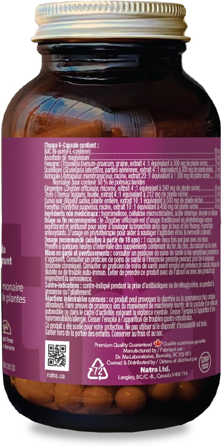Skullcap – Calming herb that helps reduce restlessness, nervous tension, and promotes relaxation. Traditionally used to support overall respiratory comfort.Ginger – Natural expectorant that helps clear airways and ease coughing. Provides relief from bronchitis, congestion, and throat irritation. Supports digestive and immune function.Black Cumin – Powerful antimicrobial and anti-inflammatory properties. Helps open airways and supports easier breathing. Promotes healthy immune and respiratory response.Thyme – Rich in natural compounds that support clear breathing and lung health. Provides antimicrobial benefits for upper respiratory protection.Forsythia – Traditional immune-boosting herb known to fight respiratory infections. Helps protect against seasonal discomforts and promotes overall wellness.Fenugreek – Supports respiratory and sinus health by soothing mucus membranes. Helps maintain healthy breathing and overall vitality.Astragalus – Immune-enhancing adaptogen standardized to 50% polysaccharides. Strengthens natural defenses and promotes long-term respiratory wellness.Magnesium Ascorbate – A buffered form of Vitamin C for enhanced absorption. Provides antioxidant protection and immune system support.NAC (N-Acetyl-L-Cysteine) – Supports lung detoxification and healthy mucus clearance. Promotes antioxidant defense and overall respiratory resilience.