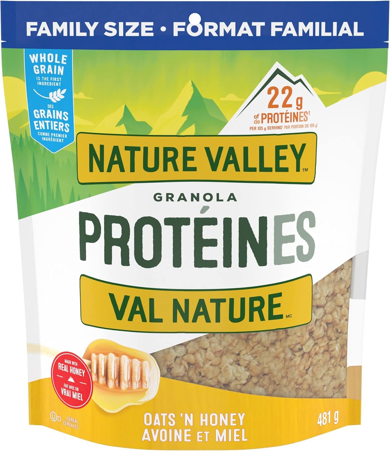 NATURE VALLEY – FAMILY SIZE PACK – Oats Honey Protein Granola Cereal, Granola Bars, Made with Real Honey, 481 Grams Package of Protein Granola