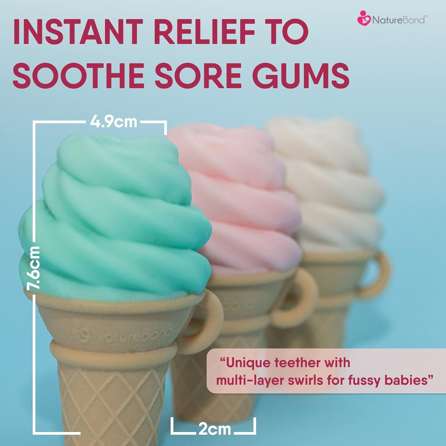 The swirls on the Ice-Cream acts as textured bumps and are meant to help massage and relief the sore gums of babies that are in the process of teething. Not only is the design aesthetically pleasing, it is also very useful to help soothe the teething pain.