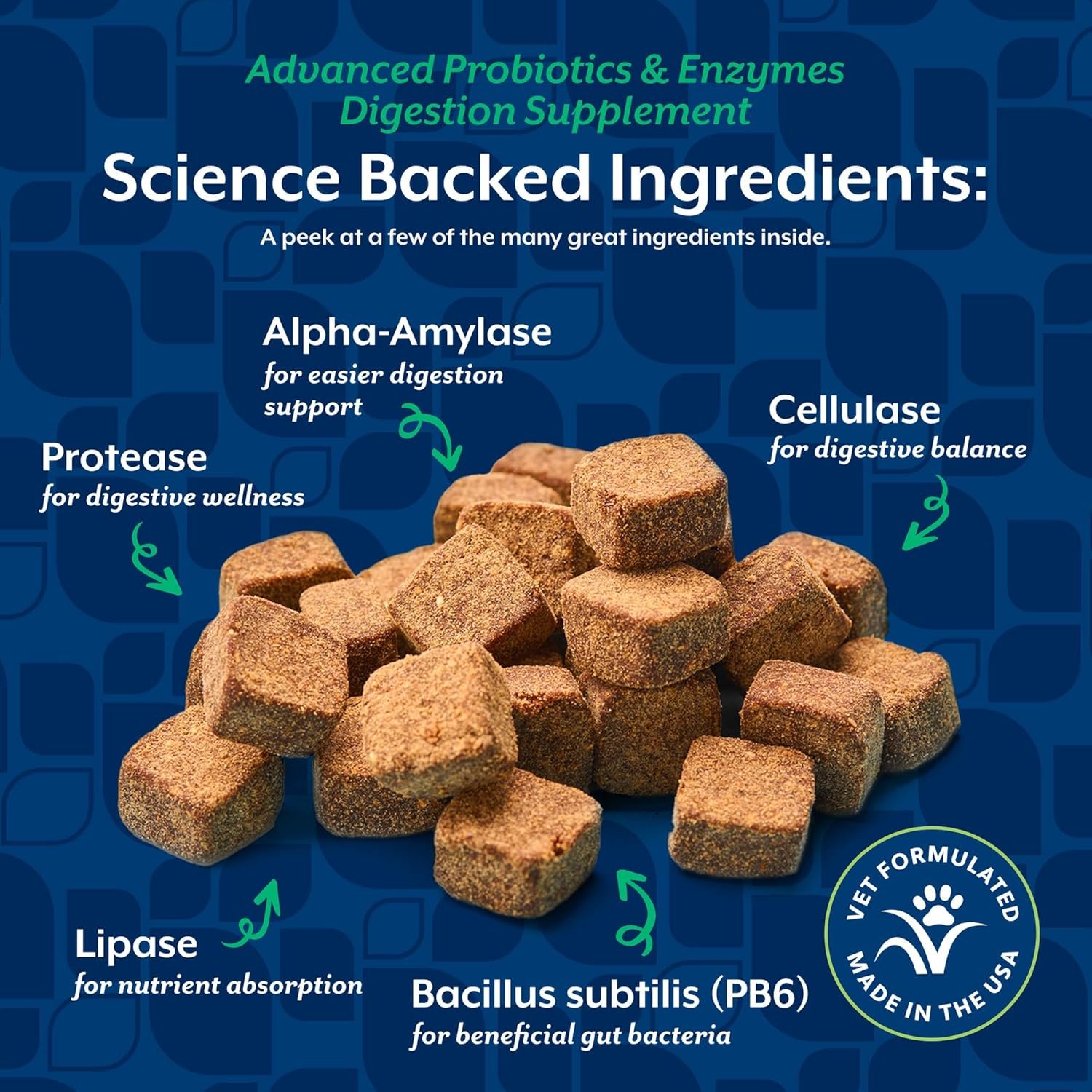 Developed to support and balance the total GI environment. PB6 technology enables beneficial bacteria to travel through the complete GI tract for optimal stomach and intestinal balance.^Provides probiotics and essential enzymes to help break down food for optimal utilization of nutrients.^Great for food transitioning, sensitive stomachs, recovering from an illness and flatulence. Recommended for advanced digestive support.^Wheat Free, Tasty Soft Chews 120ct for Dogs over the age of 6 weeks.^Guaranteed Analysis per 2 Soft Chews: alpha-Amylase, Lipase, Cellulase, Protease, Bacillus coagulans, Bacillus subtilis and Fructooligosaccharides.^All NaturVet products are veterinarian formulated and manufactured in the USA in an FDA audited, cGMP compliant facility.^100% Satisfaction Guarantee.