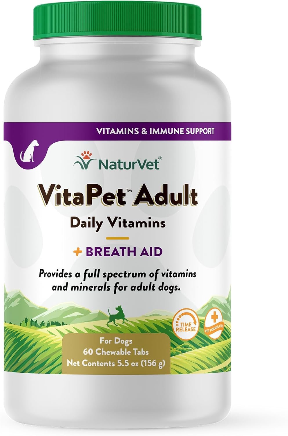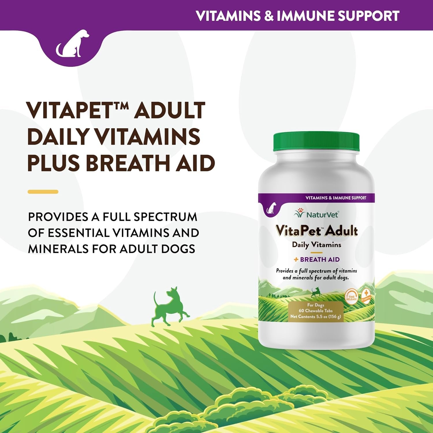 NaturVet VitaPet Adult Daily Vitamins Plus Breath Aid for Adult Dogs, 60 ct Time Release, Chewable Tablets, Made in USA