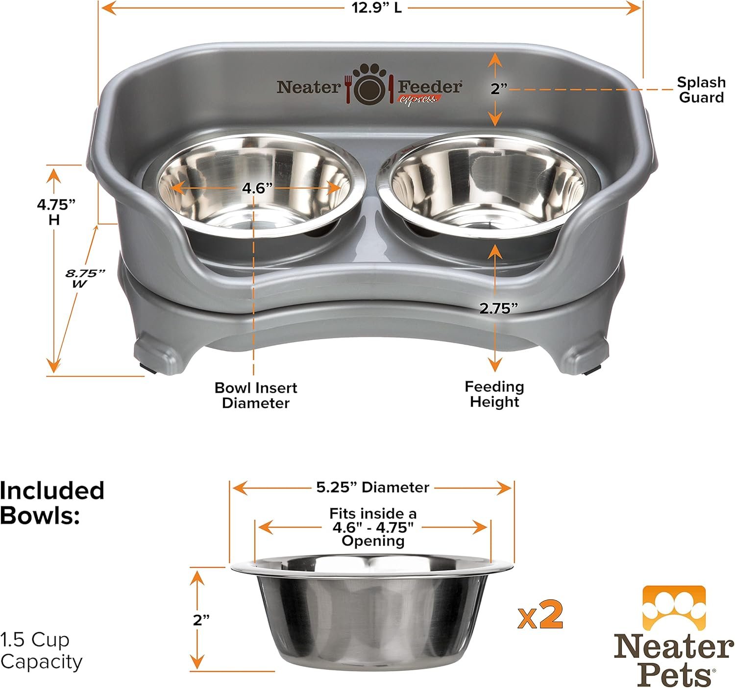 Neater Feeder Express Mess Proof Dog Bowls Elevated for Small Breeds Under 15 Lb, Made in USA, No Spill Raised Dog Food Bowl Stand, Stainless Steel Food and Water Bowl Set, Feeding Station, Grey