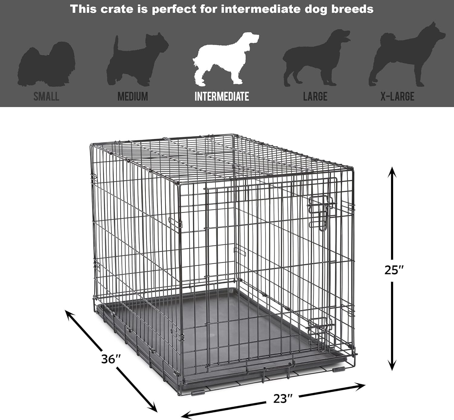 New World single door dog crate measures 36L x 23 x 25 inches and is suitable for intermediate dog breeds with an adult weight of 40 to 70 pounds. If your dog s weight or measurements are on the higher side for this crate, we recommend buying the next crate size up. When in doubt, bigger is better
