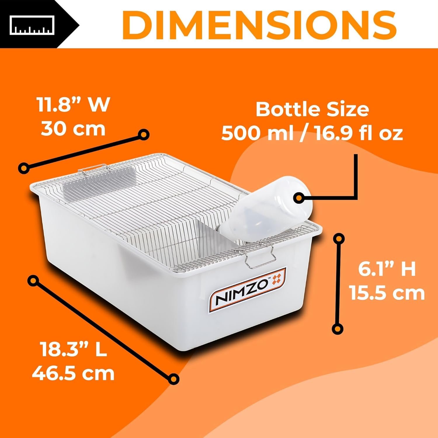 Dimensions -18.3″ L x 11.8″ W x 6.1″ H (46.5cm L x 30cm W x 15.5cm H). The weight of each lab rodent cage including its bottle is 2.93 lbs or 1.33 kg. This large lab rodent breeding cage can be used as a rat breeding cage, an asf breeding cage, or a mouse breeding cage