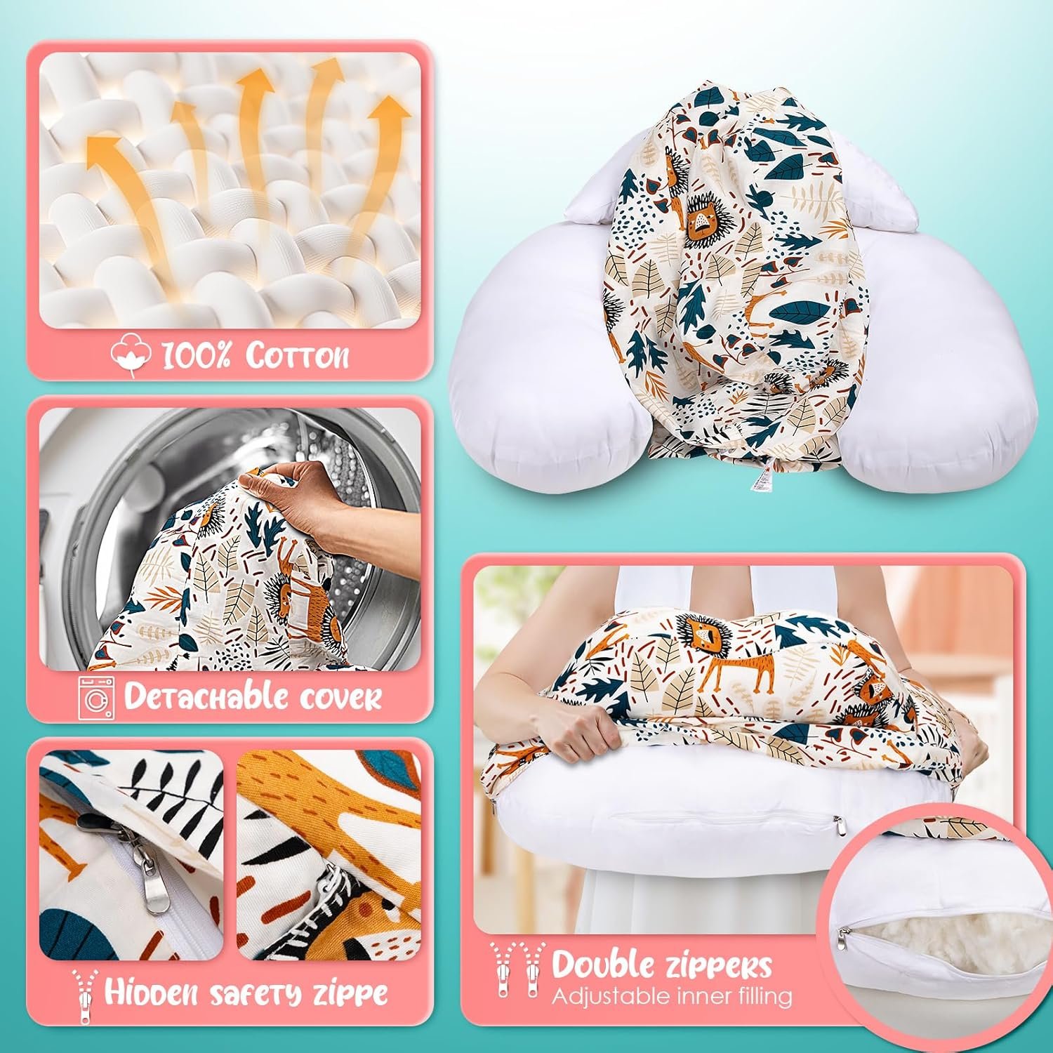 【EASY CARE】 Our nursing pillow includes a removable slip cover. It provides breathability, soft & gentle surface for your baby’s sensitive skin. Machine-washable cover but don’t machine wash or dry the pillow core that has built-in dustproof liner.
