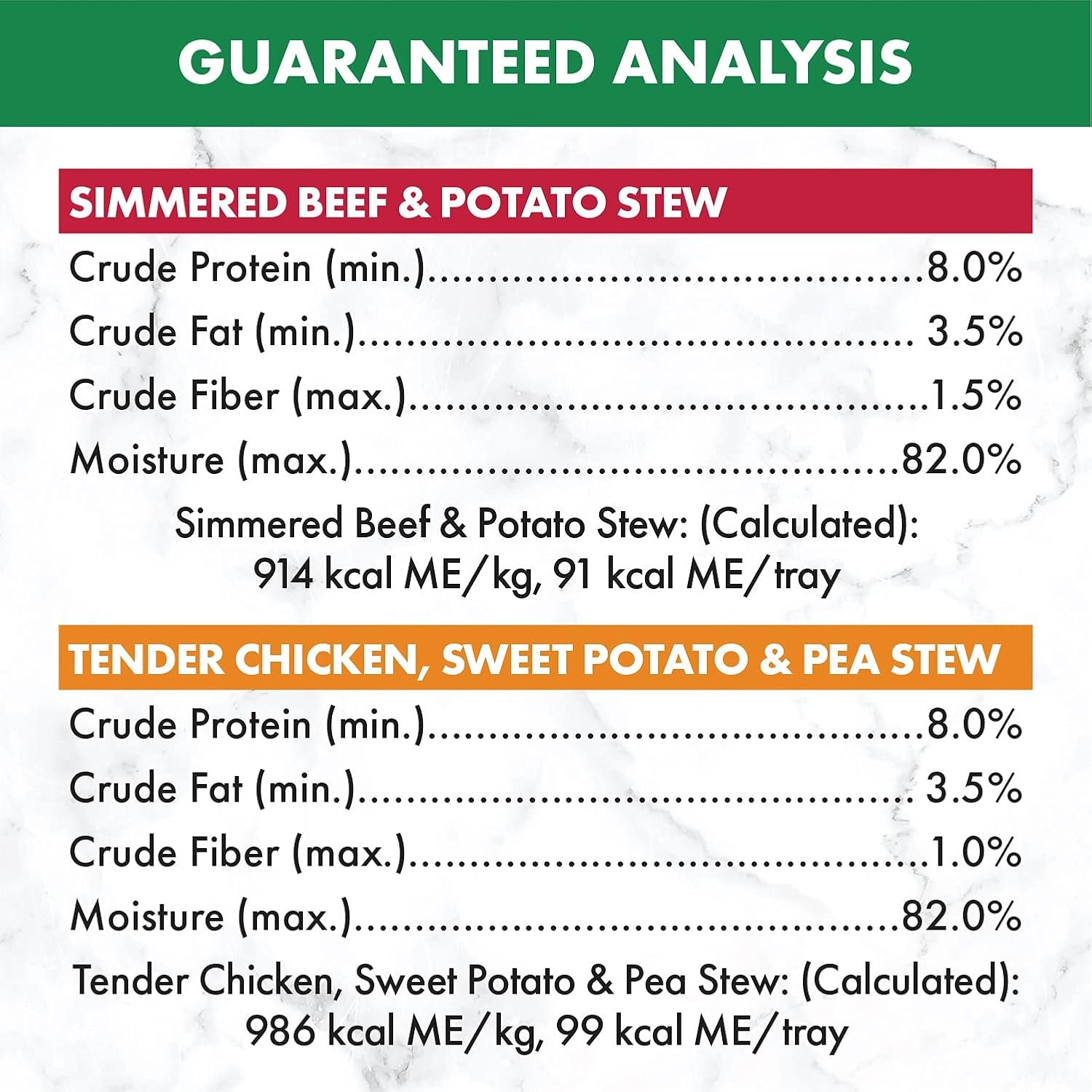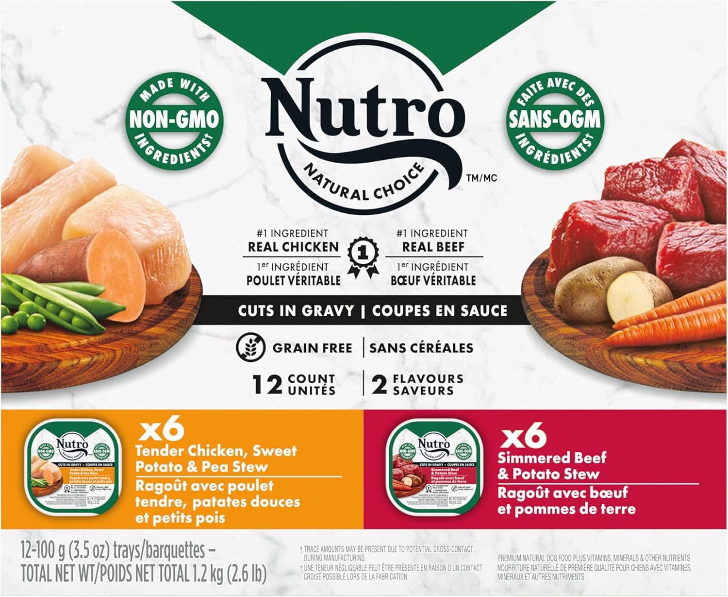 Contains one (1) 12-count of 100g trays of NUTRO Natural Choice Adult Wet Dog Food Cuts in Gravy Tender Chicken, Sweet Potato & Pea Stew and Simmered Beef & Potato Stew: (6) Cuts in Gravy Tender Chicken, Sweet Potato & Pea Stew (6) Cuts in Gravy Simmered Beef & Potato Stew