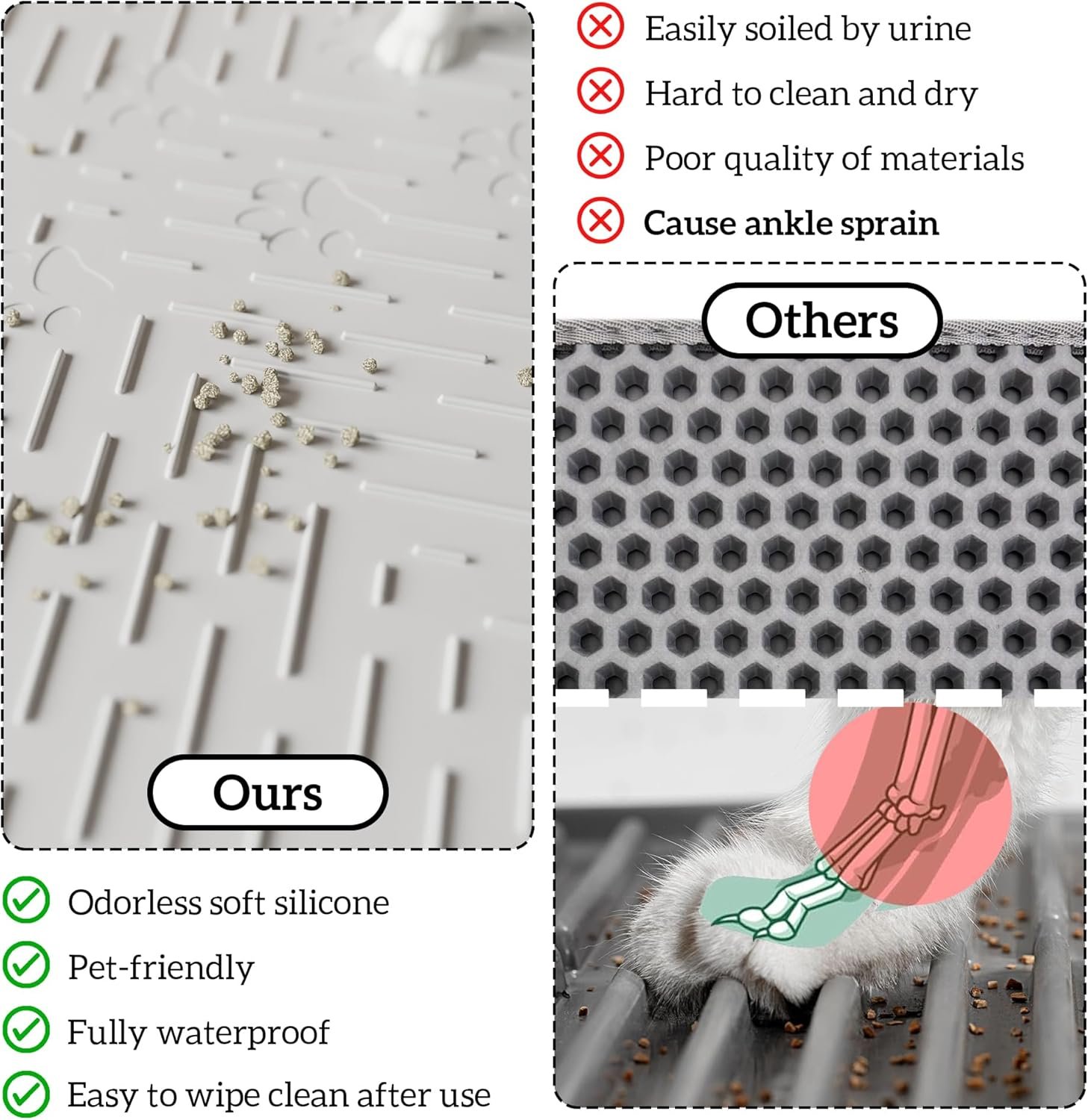 Premium Grade Silicone:Non-porous and waterproof silicone prevents odor and stains from setting in. This cat litter mat feels soft and gentle to the touch. Its durable material allows the mat to bounce back to its original shape effortlessly, even after repeated folding.