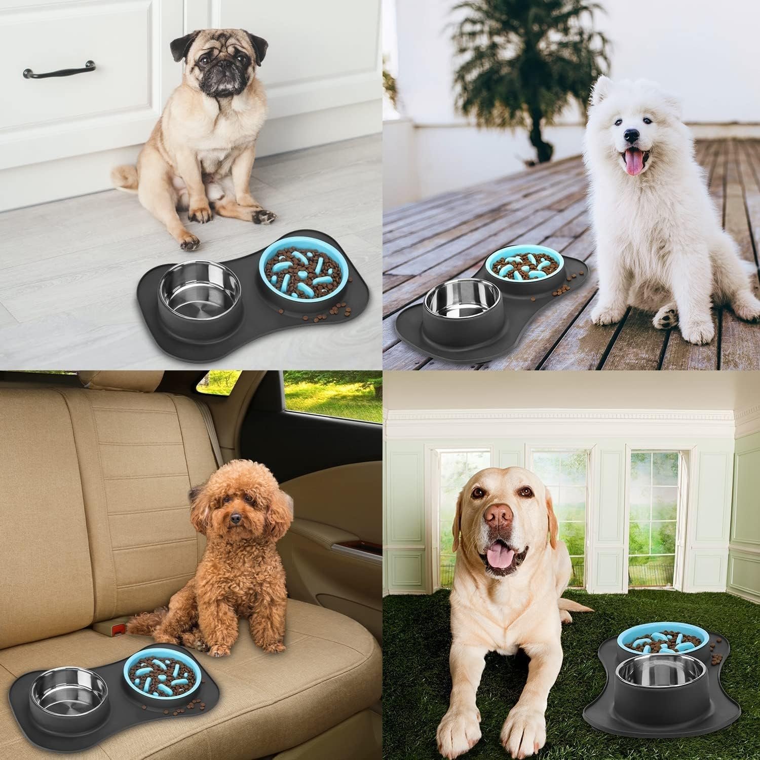 Oillase Slow Feeder Dog Bowls 3 in 1 Stainless Steel Food and Water Bowls with Non-Spill and Skid Silicone Mat to Slow Down Eating for Large Medium Small Breed Size Dogs and Cats