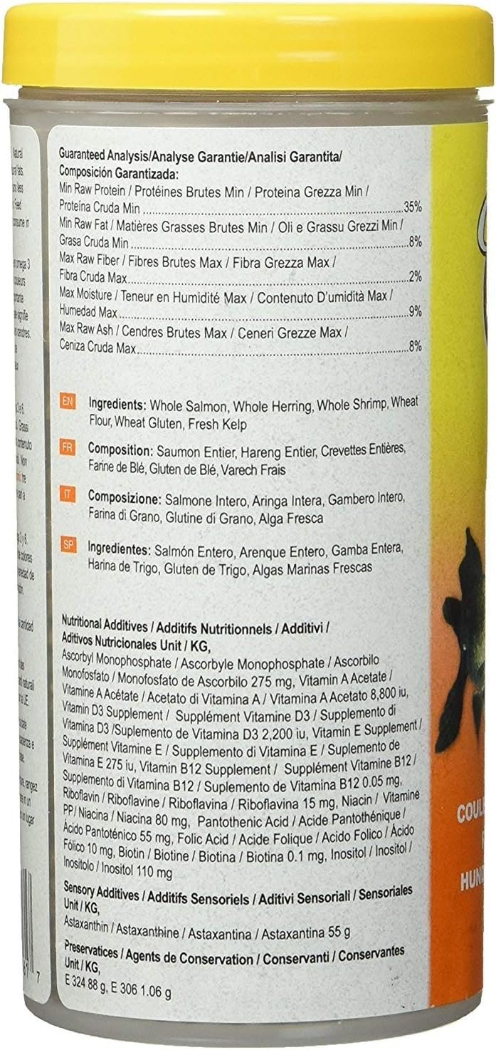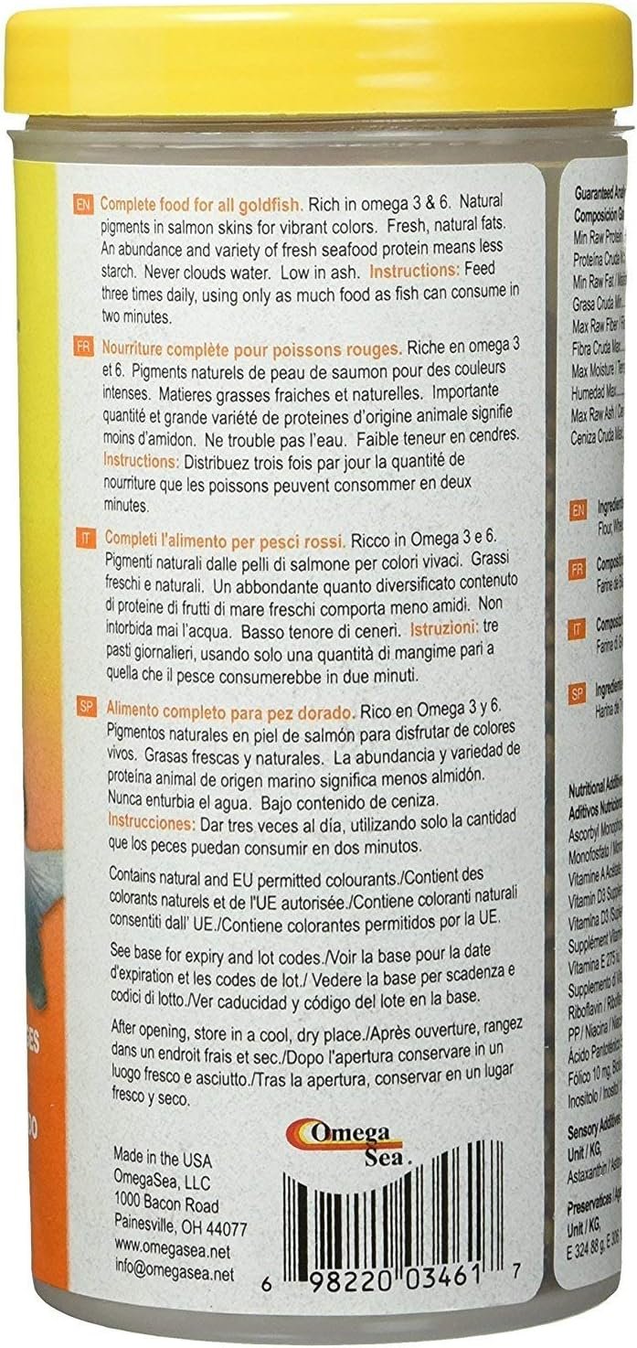 3 pack. Complete food for all goldfish. Rich in omega 3 and 6. Natural pigments in salmon skins for vibrant colors. Fresh, natural fats. An abundance and variety of fresh seafood protein means less starch. Never clouds water. Low in ash. Instructions: Feed 3 times daily, using only as much food as fish can consume in 2 minutes.