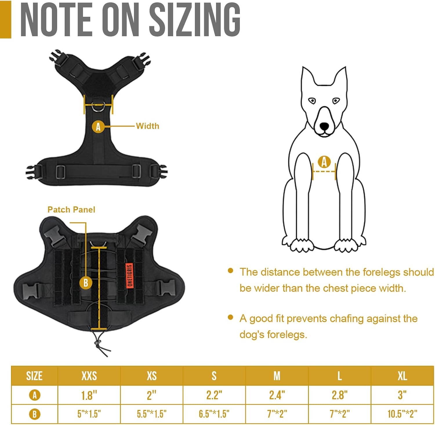 No pull Dog Tactical Vest.XS: 11″- 17″(Neck); 15″- 22″(Chest); 7″(Back) S: 14″- 20″(Neck); 20″- 27″(Chest); 9″(Back) M: 16″- 23″(Neck); 24″- 32″(Chest); 10″(Back) L: 18″-25″(Neck); 27″- 36″(Chest); 11″(Back) XL: 20″- 29″(Neck); 31″- 40″(Chest); 13″(Back). Ideal for Medium Breeds such as Boston Terrier, Dachshund, Heeler, Bulldog, Boxer, Puggle, Australian Shepherd, etc. A professional working dog vest for service, police or military dogs, but also good for hunting and all outdoor companion dogs