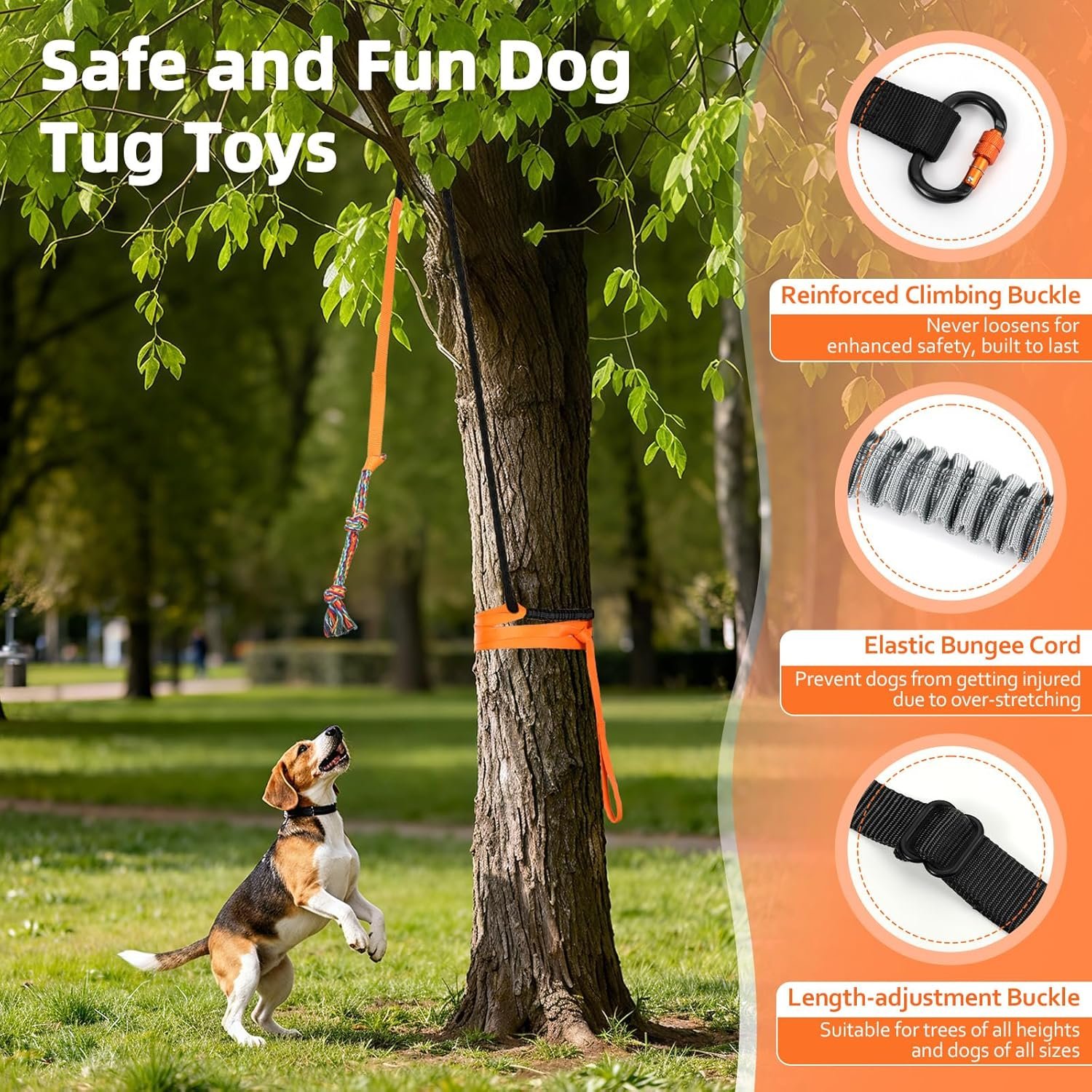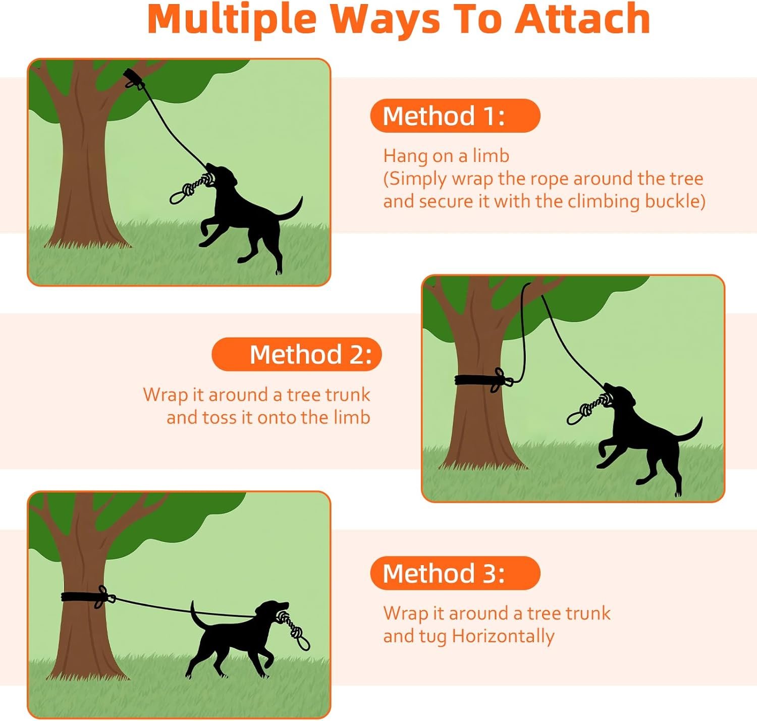 Easy to Set up: This tree tugger dog toy can be set up in minutes. Simply thread the elastic rope through the chew rope toy, then throw the elastic rope over a sturdy tree branch, wrap it around and pull it tight. Finally, you can adjust the height of the rope to make it more challenging for your furry friend to play with.