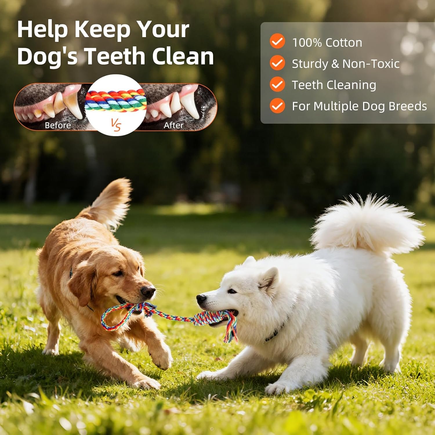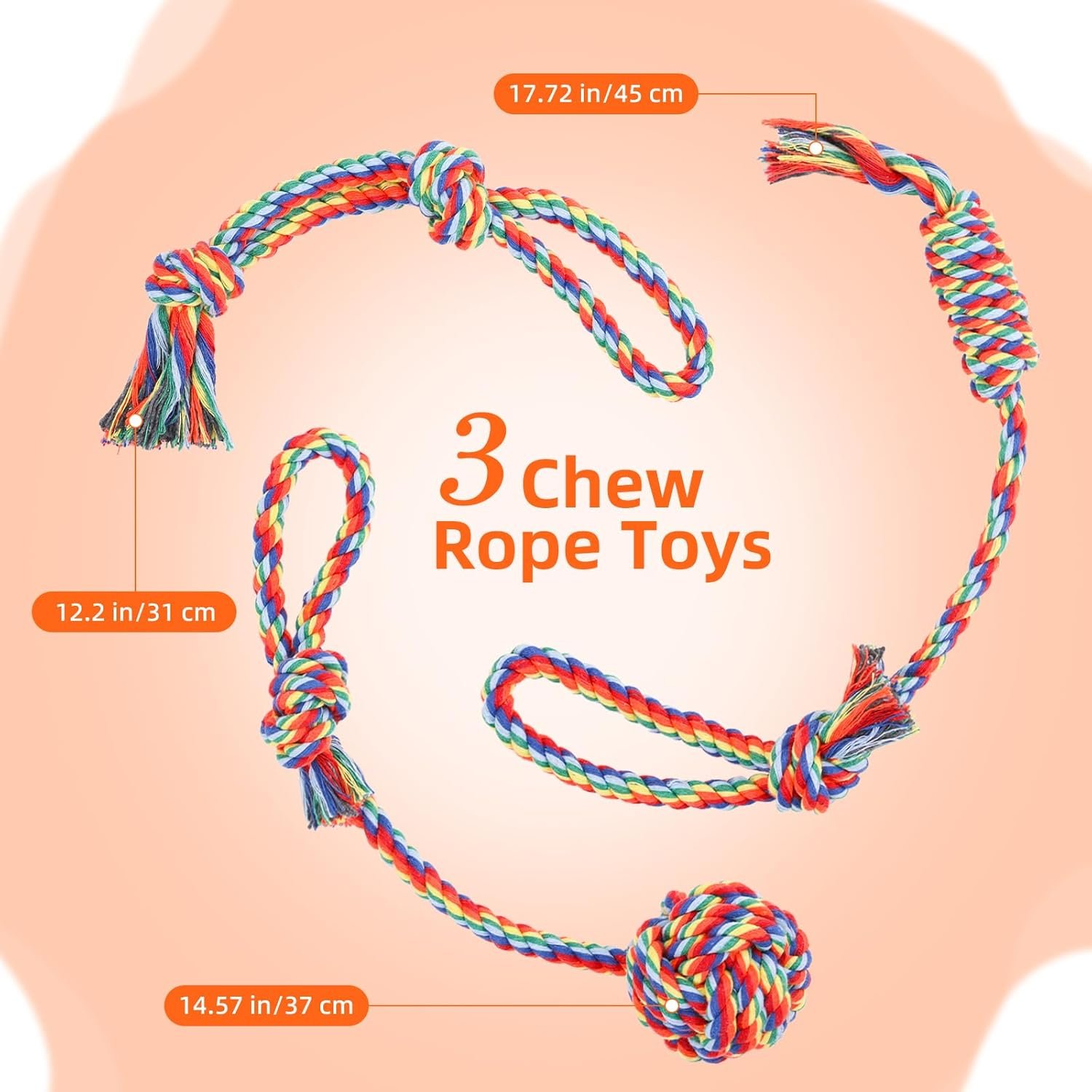 3 Chew Rope Toys: The dog chew ropes are made of wear-resistant polyester fiber, which easily and gently helps clean your dog’s teeth. They come in 3 different styles, so changing them regularly will keep your dog interested. These tug of war dog toys are also suitable for large, medium and small dogs, so dogs of all different sizes in your home can enjoy them.