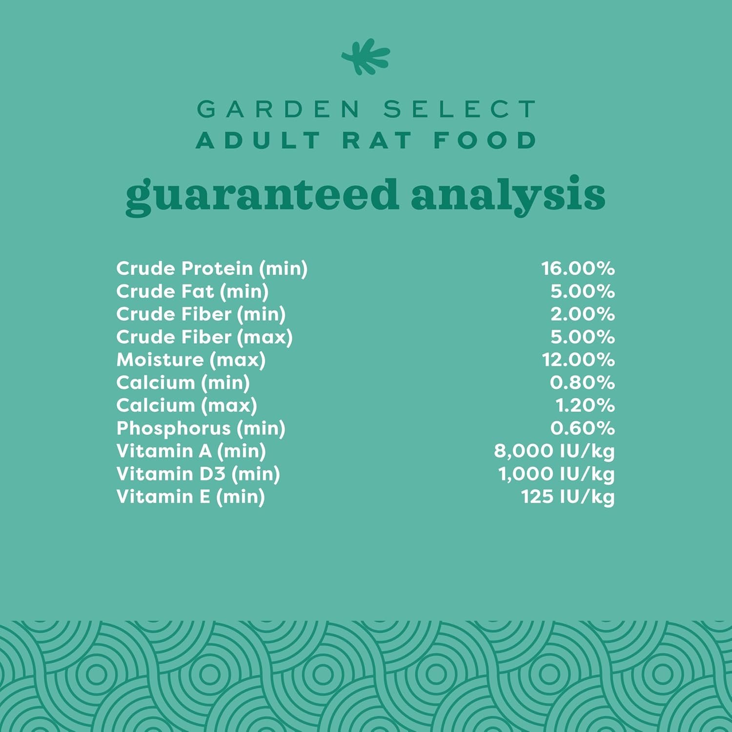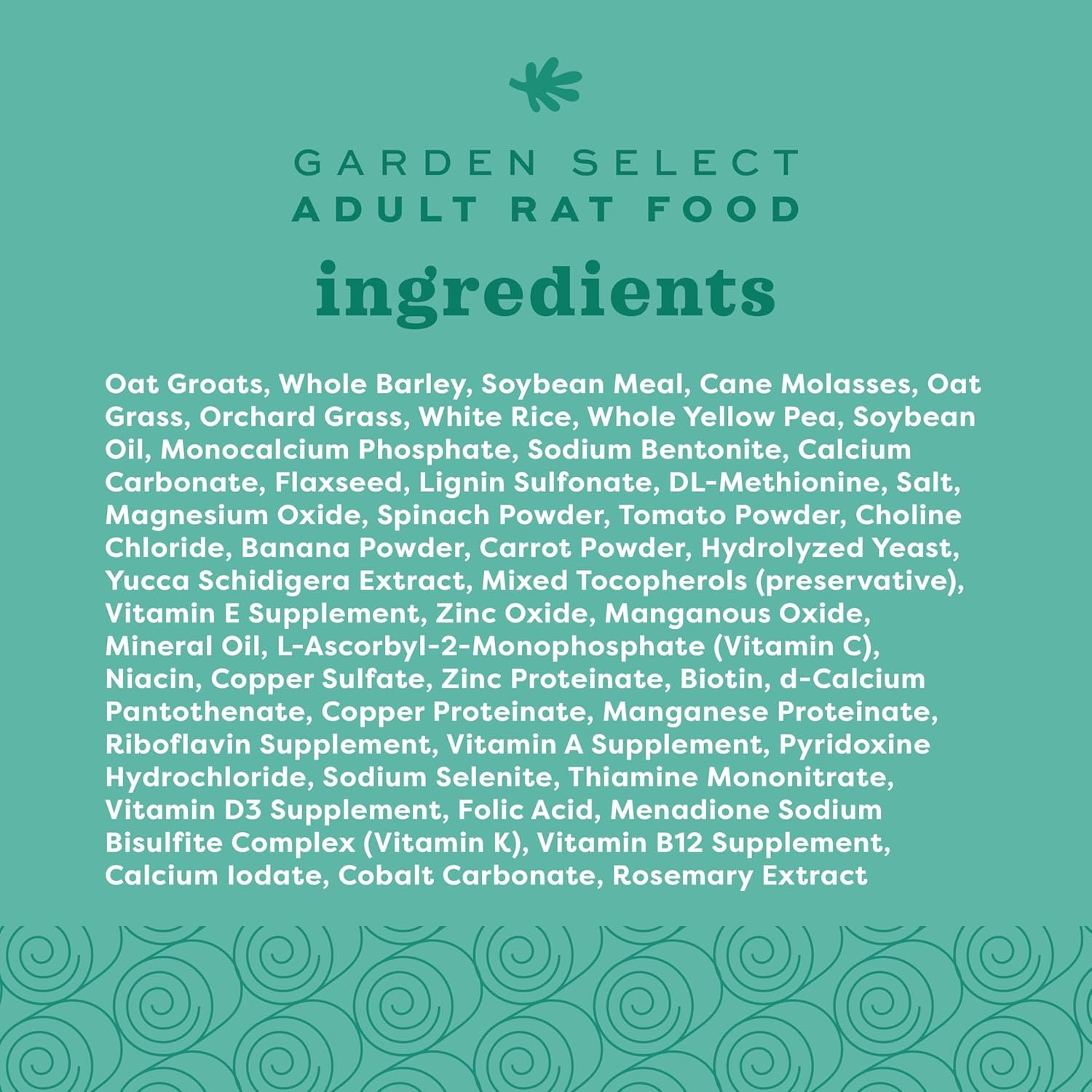 SUPPORTS DIGESTIVE HEALTH: Garden Select Adult Rat is formulated with prebiotics and chelated minerals to support beneficial gut bacteria, improve absorption of essential nutrients, and promote long-term digestive balance and vitality for adult rats