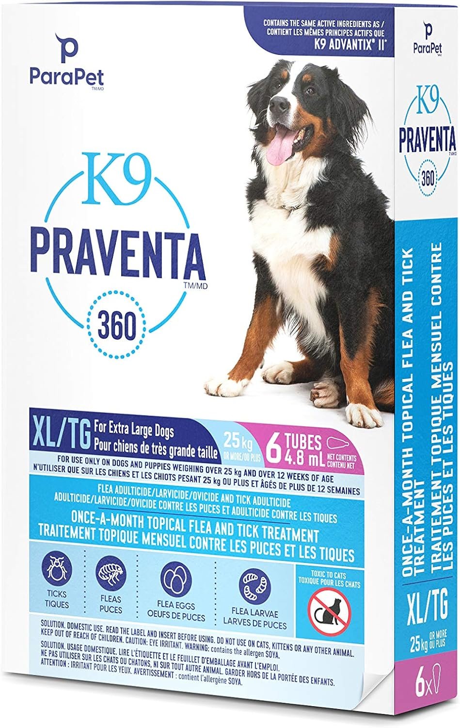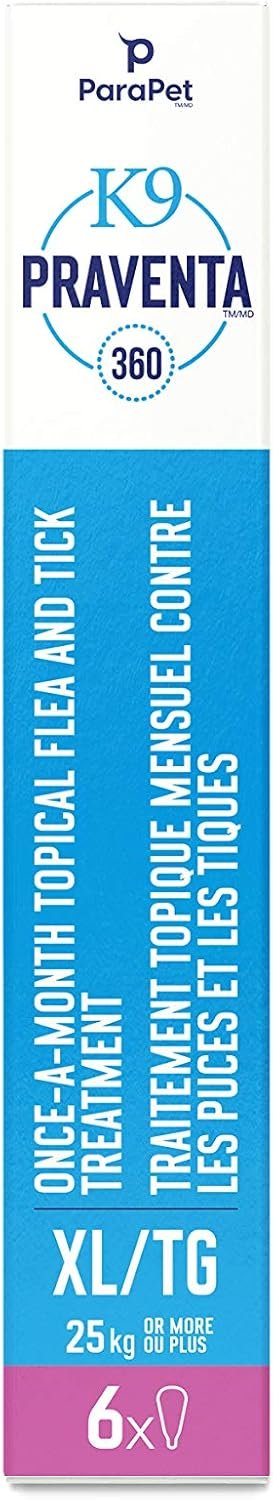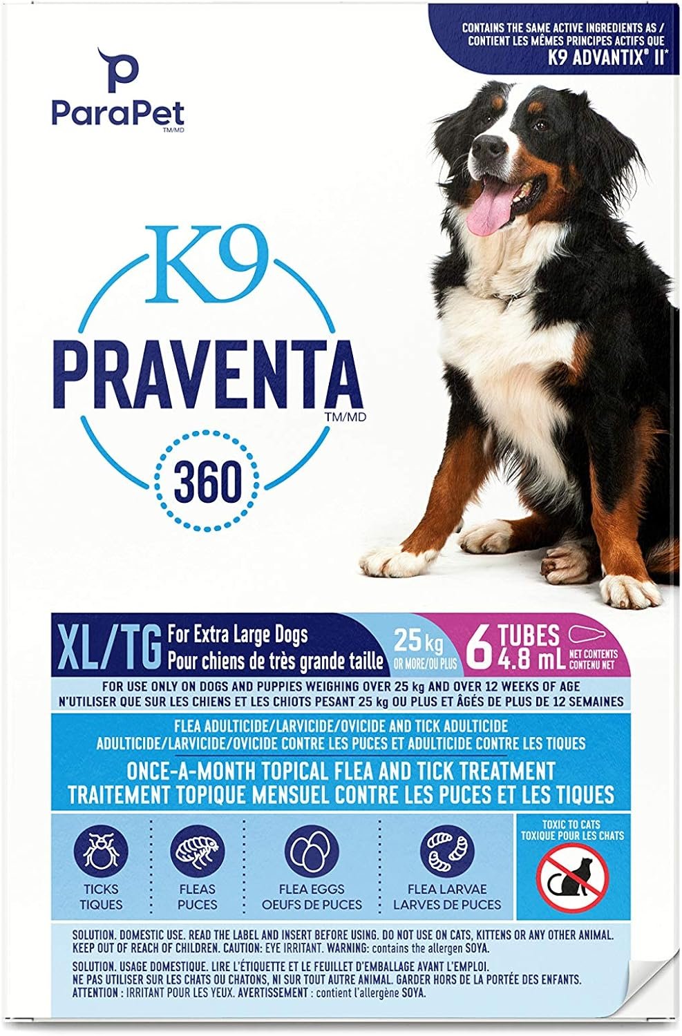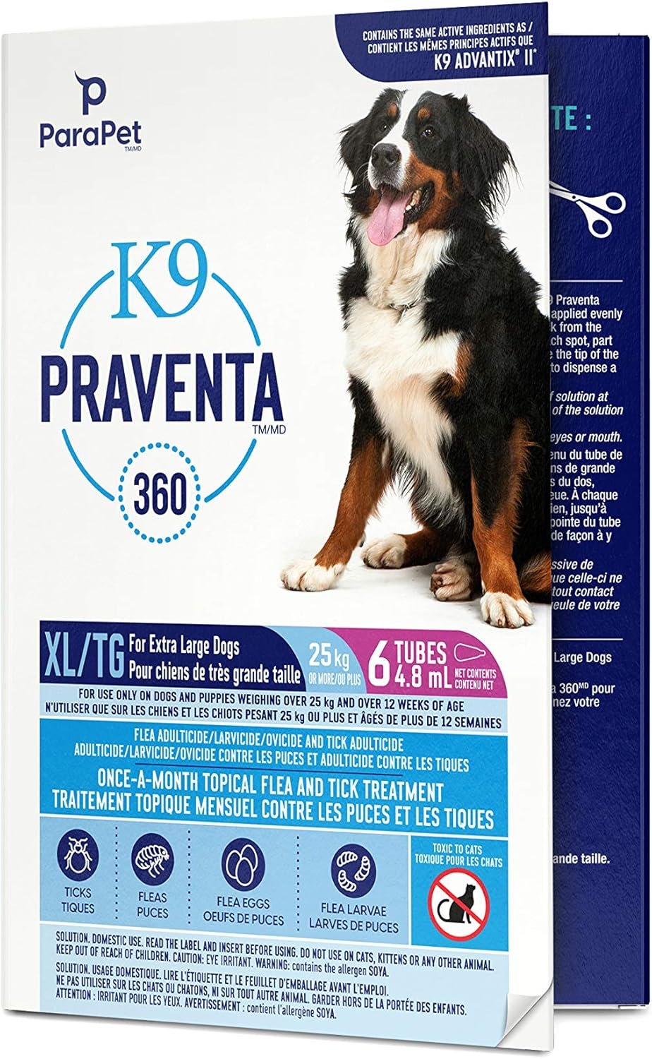 K9 Praventa 360 for Dogs is a fast-acting, monthly topical flea & tick treatment. Containing Imidacloprid, Permethrin and Pyriproxyfen, the same active ingredients found in the leading veterinary brand, K9 Praventa 360 for Dogs is a vet-quality, broad-spectrum treatment that kills and repels fleas and ticks on contact. Applying a topical is important to control flea infestations. K9 Praventa 360 for Dogs not only kills adult fleas but affects each life stage, continuing to work by preventing flea eggs and larvae from developing. The benefit of a topical is that it kills pests on contact rather than by ingestion, therefore it does not enter the pet’s bloodstream. K9 Praventa 360 provides long-lasting protection, controlling fleas and ticks within one day of treatment and continuing to protect the dog from further infestation for up to four weeks.
