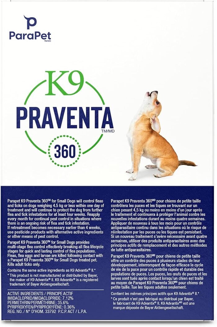K9 Praventa 360 for Dogs is a fast-acting, monthly topical flea & tick treatment. Containing Imidacloprid, Permethrin and Pyriproxyfen, the same active ingredients found in the leading veterinary brand, K9 Praventa 360 for Dogs is a vet-quality, broad-spectrum treatment that kills and repels fleas and ticks on contact. Applying a topical is important to control flea infestations. K9 Praventa 360 for Dogs not only kills adult fleas but affects each life stage, continuing to work by preventing flea eggs and larvae from developing. The benefit of a topical is that it kills pests on contact rather than by ingestion, therefore it does not enter the pet’s bloodstream. K9 Praventa 360 provides long-lasting protection, controlling fleas and ticks within one day of treatment and continuing to protect the dog from further infestation for up to four weeks.