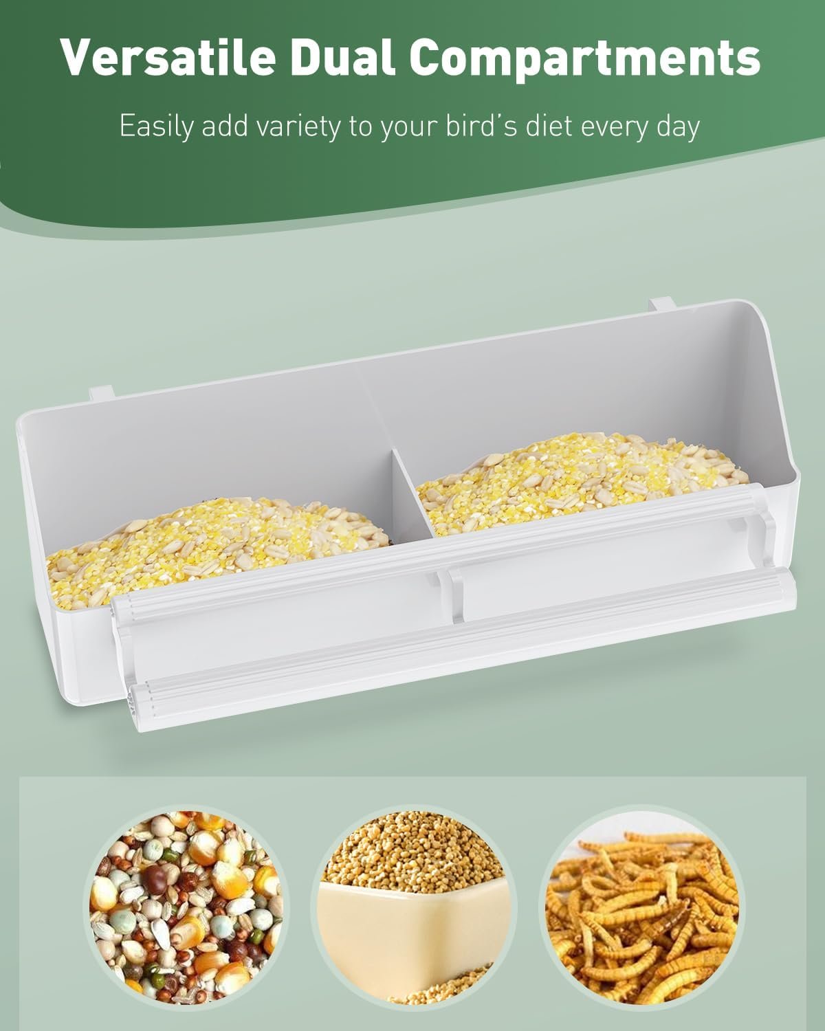 Versatile Dual Compartments: Size: 8.2″ L x 2″ W x 2.6″ H. Ideal bird cage feeder for serving different types of bird foods or keeping water and food separate. Perfectly add variety to your bird’s diet while keeping their nourishment clean and organized