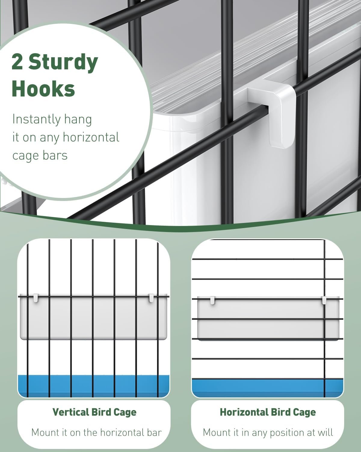 Easy to Use: With 2 sturdy hooks on the back, the bird water dispenser can be instantly hung on any horizontal cage bars. No extra tools required! You can also detach it in seconds for quick cleaning or refilling, making daily bird care a breeze
