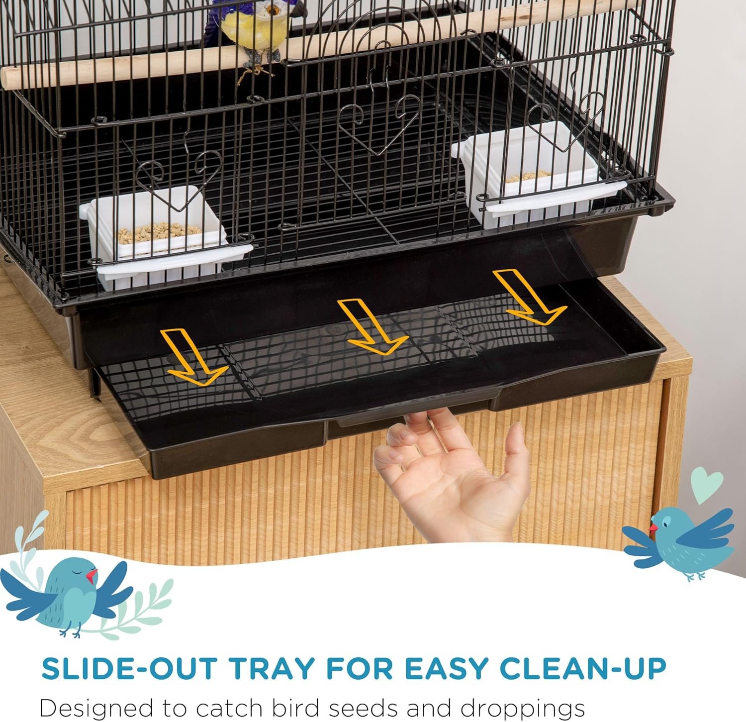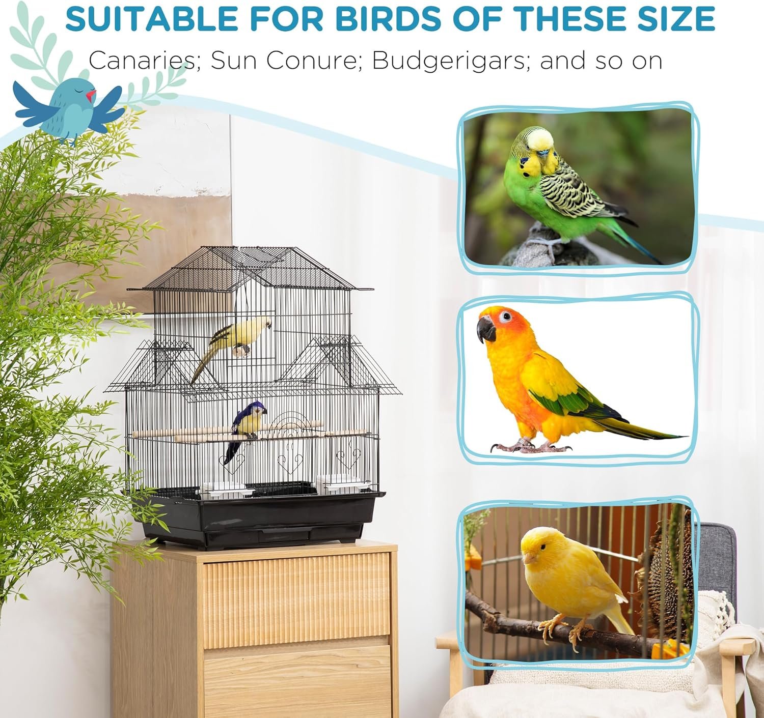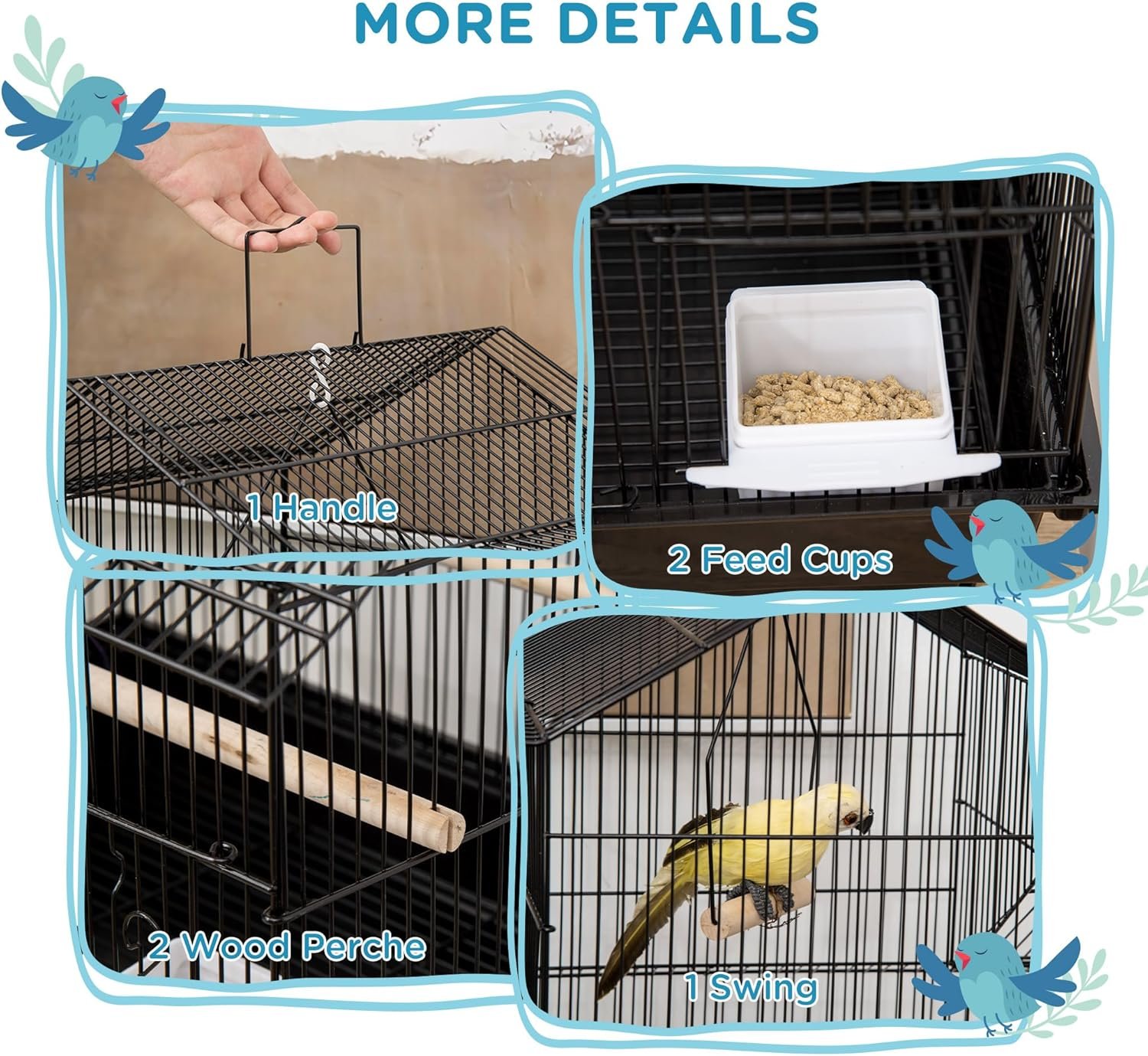 Solid metal frame, steel wire, and solid plastic construction are built to last Suitable for small birds like finch, canary and budgie etc. Large front doors for birds’ easy access to the inside area Included sliding food doors for easy access to your birds’ food and water Includes a swing, 2 perches and 2 plastic food containers A handle on top for easy transport Quick clean with the bottom slide-out plastic tray Roof-shaped design increases the living space for your feathered friends